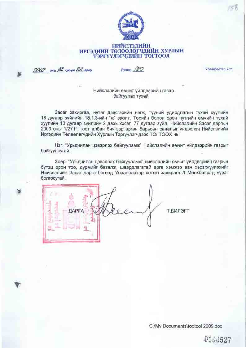 | НИТХТ-ийн тогтоол | 2009-12-22 | 180 | Урьдчилан цэвэрлэх байгууламж |