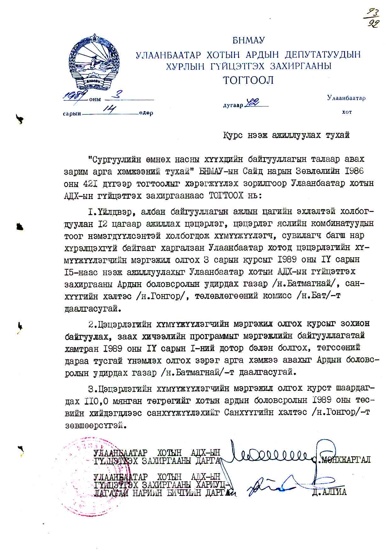 | АДХГЗ-ны тогтоол | 1989-03-14 | 42 | Цэцэрлэгийн хүмүүжүүлэгчийн мэргэжил олгох курс |