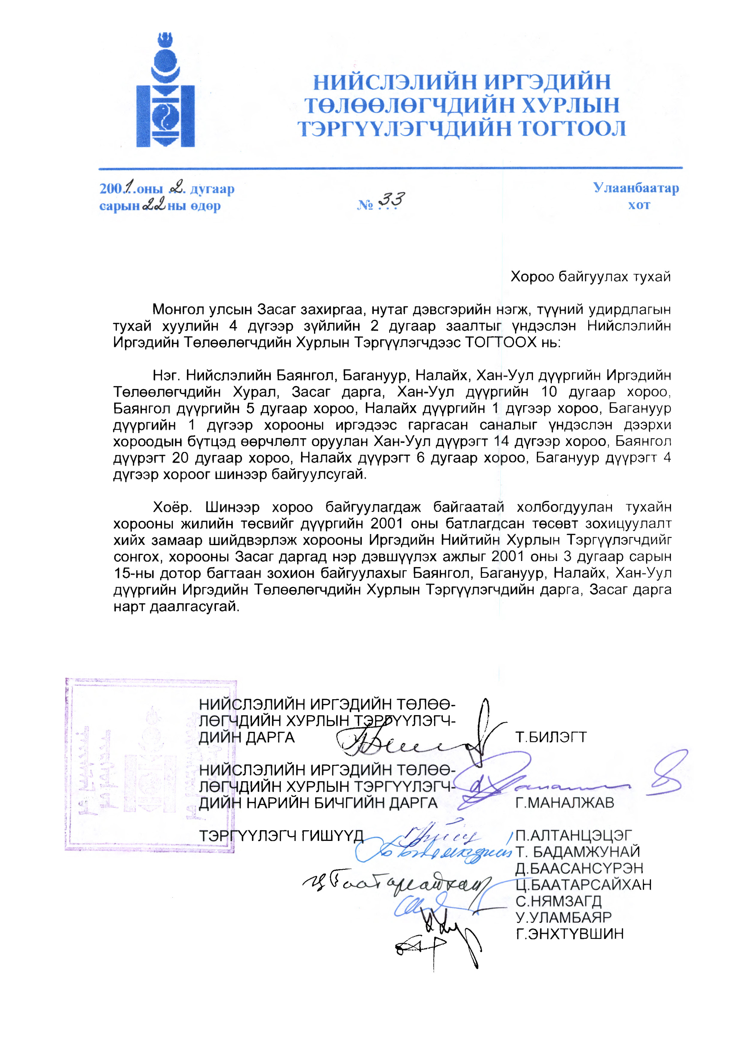 | НИТХТ-ийн тогтоол | 2001-02-22 | 33 | |