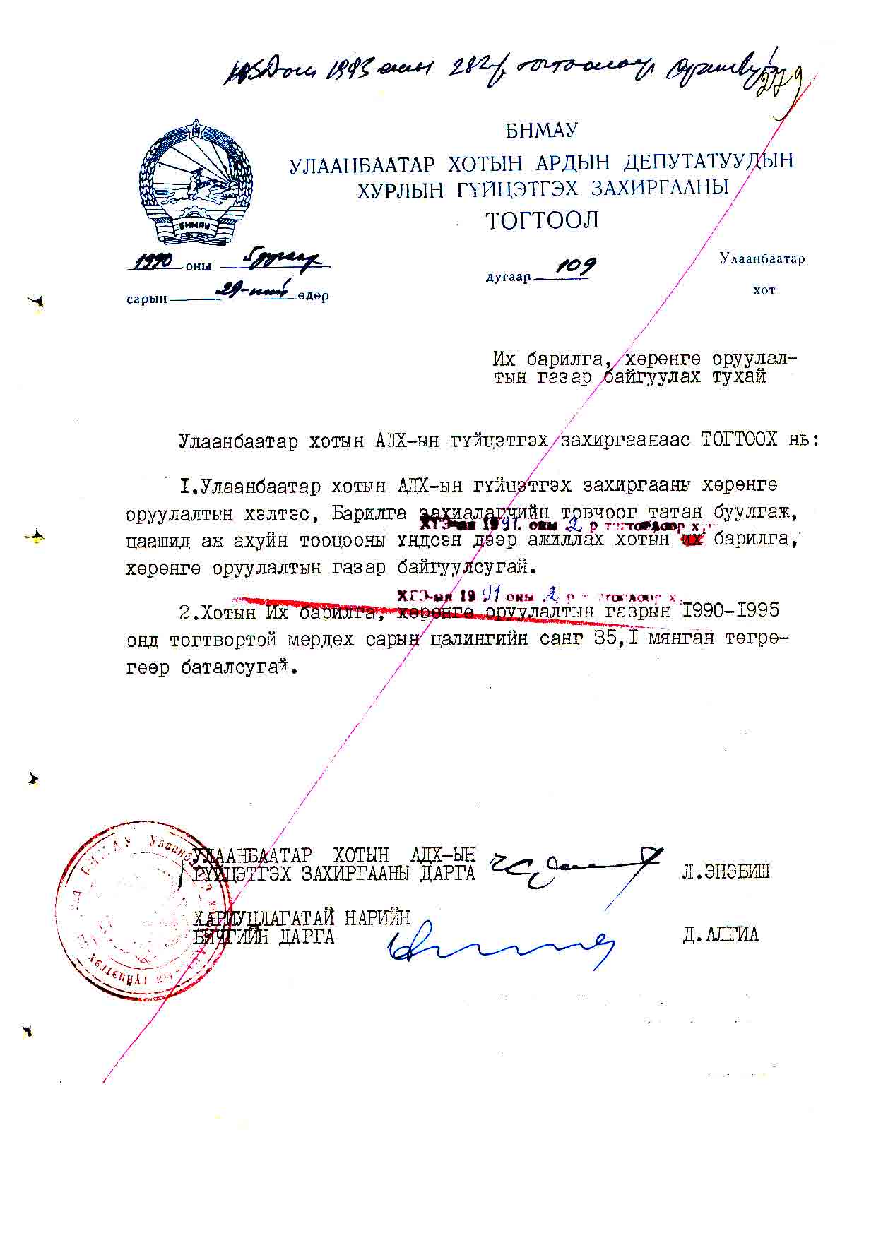 | АДХГЗ-ны тогтоол | 1990-05-29 | 109 | |