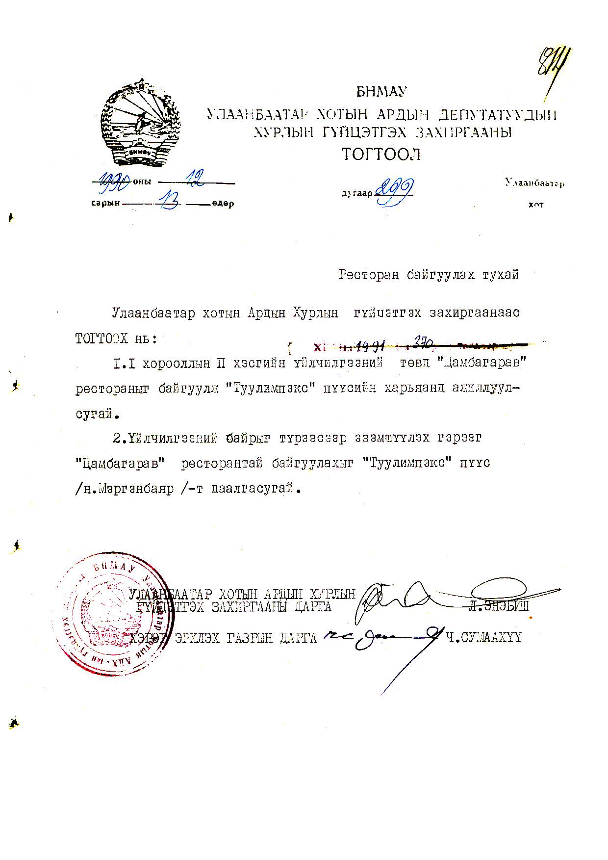 | АДХГЗ-ны тогтоол | 1990-12-13 | 299 | Туул импекс пүүсийн харьяа Цамбагарав ресторан |