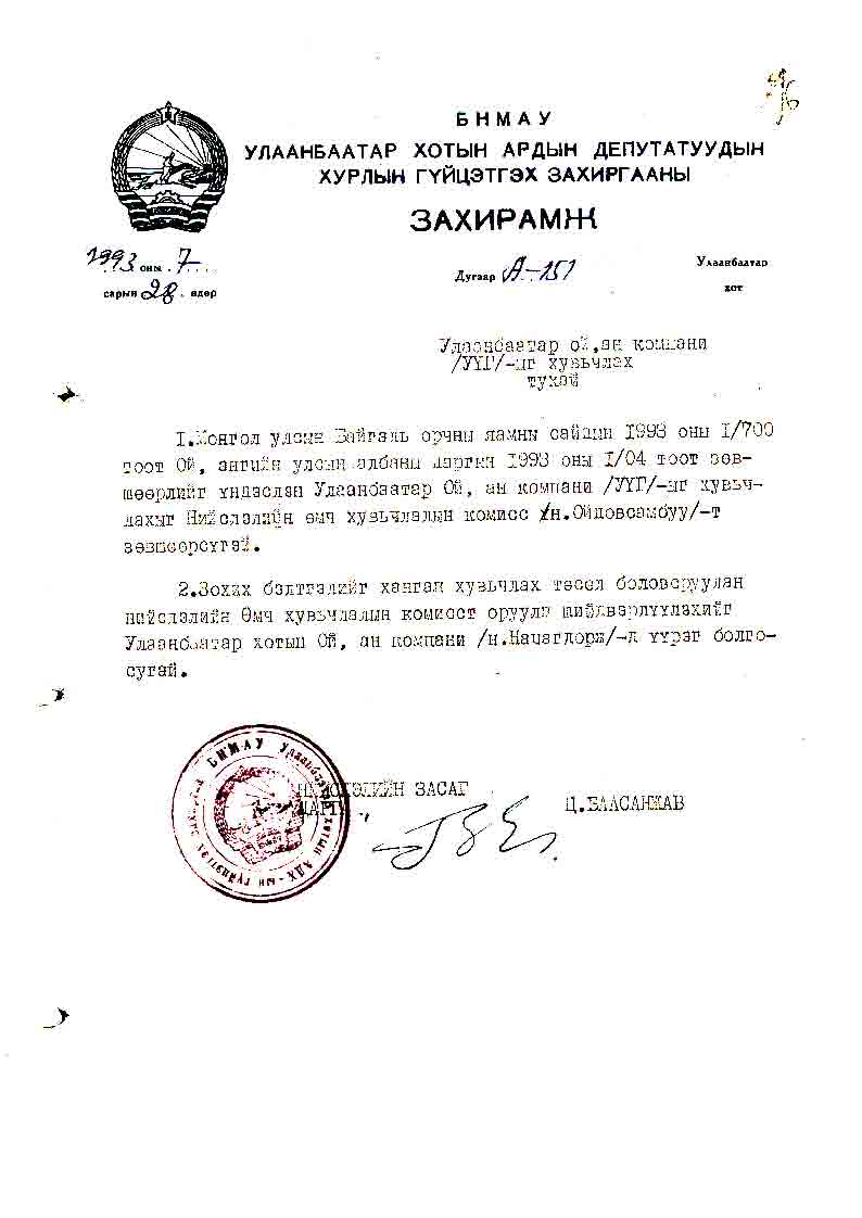 | АДХГЗ-ны захирамж | 1993-07-28 | А/151 |