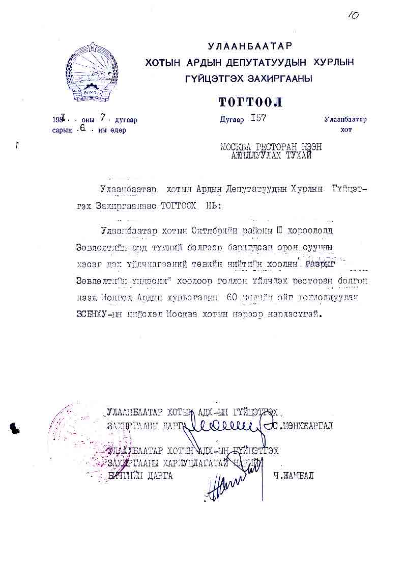 | АДХГЗ-ы тогтоол | 1981-07-06 | 157 | Москва ресторан |