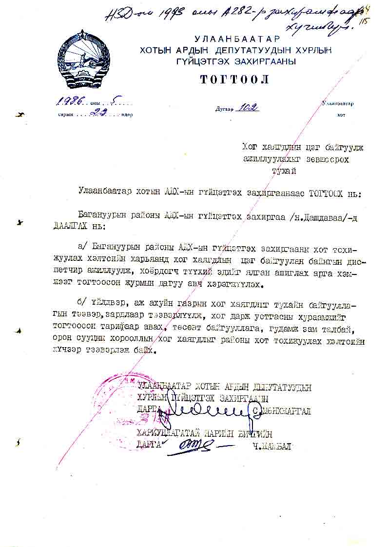 | УБ хотын АДХГЗ-ы тогтоол | 1986-05-22 | 102 | Хог хаягдалын цэг /Багануурын районд/ |