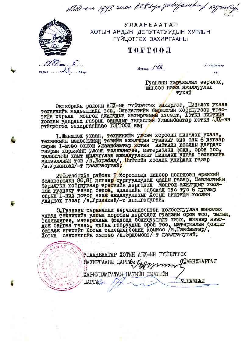 | УБ хотын АДХГЗ-ы тогтоол | 1987-05-23 | 143 | Монгол ажилчдыг хооллох гуанз /Зөвлөлтийн барилгын 2-р трестийн дэргэдэх/ |