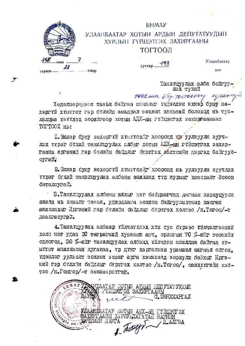 | УБ хотын АДХГЗ-ы тогтоол | 1988-07-28 | 193 | Танилцах алба |