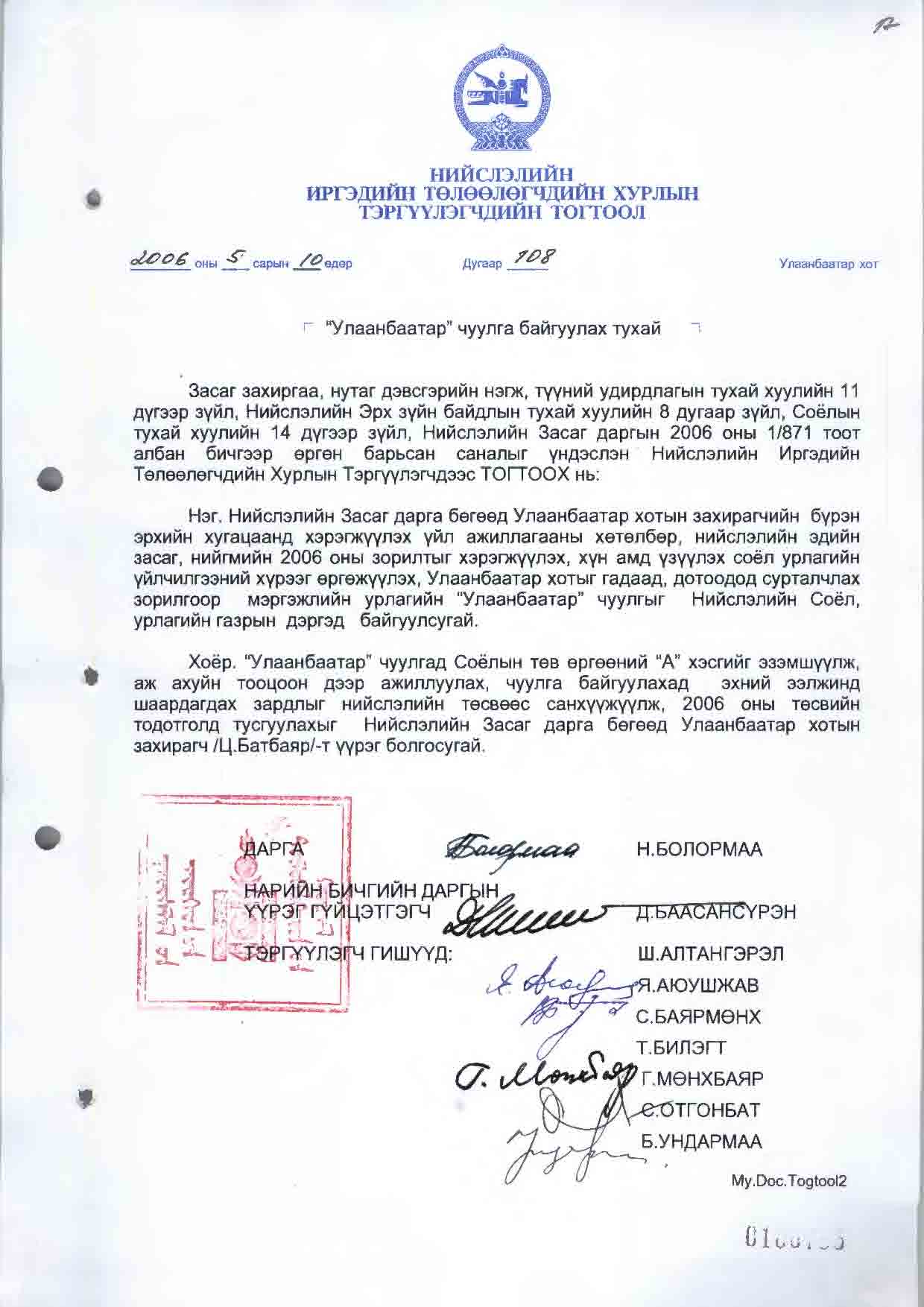 | НИТХТ-ийн тогтоол | 2006-05-10 | 108 | |