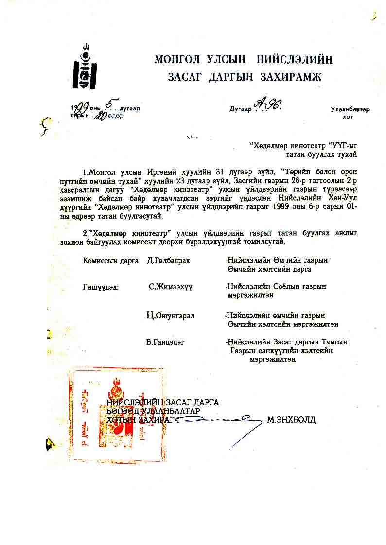 | Улаанбаатар хотын АДХГЗ-ны тогтоол | 1975-09-11 | 171 | Улаанбаатар хотын кино үзвэрийн конторын дүрэм |