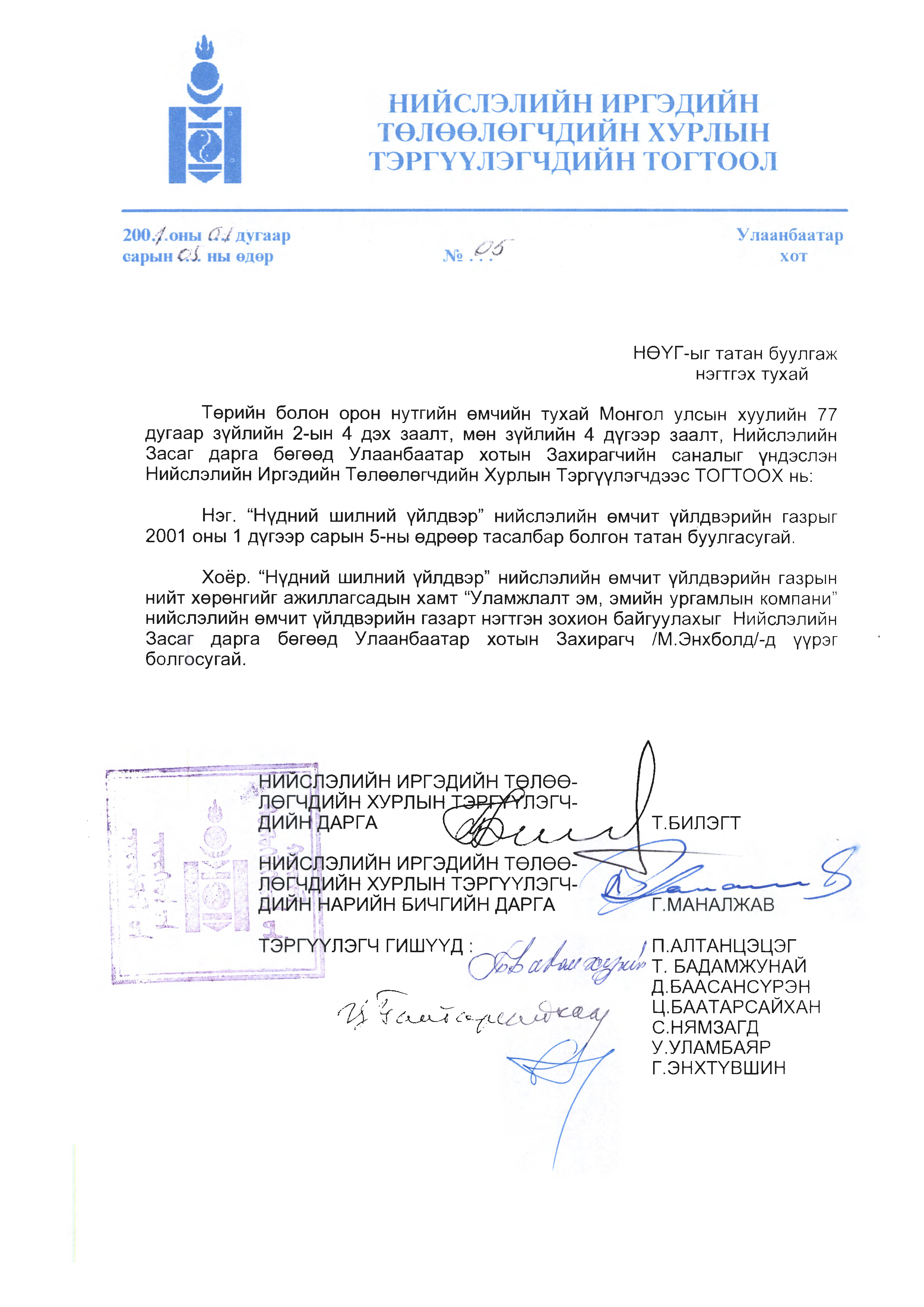 | НИТХ-ын тогтоол | 2001-01-05 | 5 |