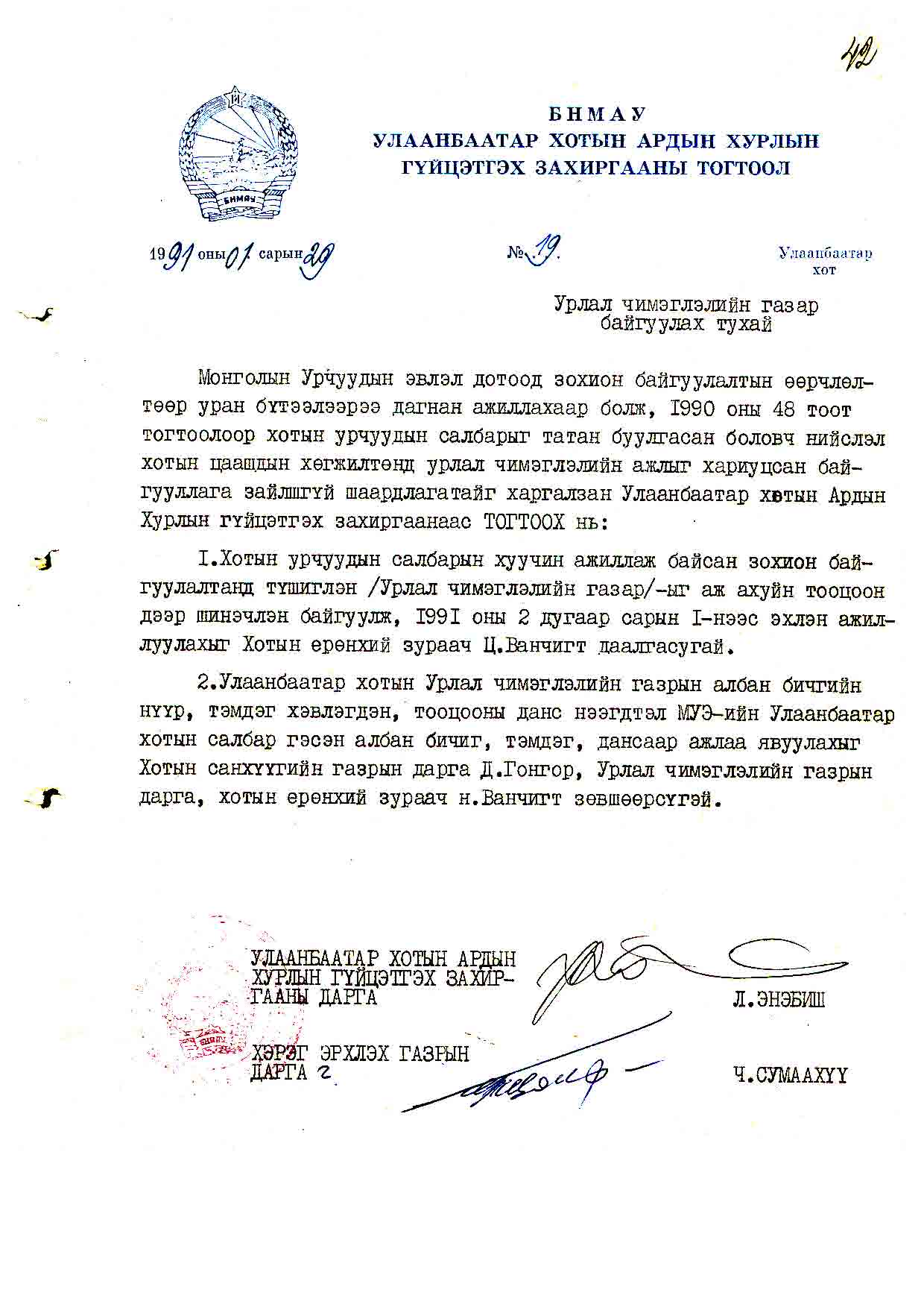 | УБ хотын АДХГЗ-ны тогтоол | 1991-01-29 | 19 | Урлал чимэглэлийн газар |
