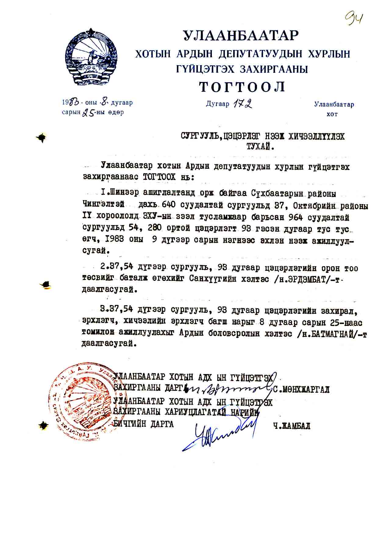 | УБ хотын АДХГЗ-ы тогтоол | 1983-08-25 | 172 | 37 дугаар сургууль |