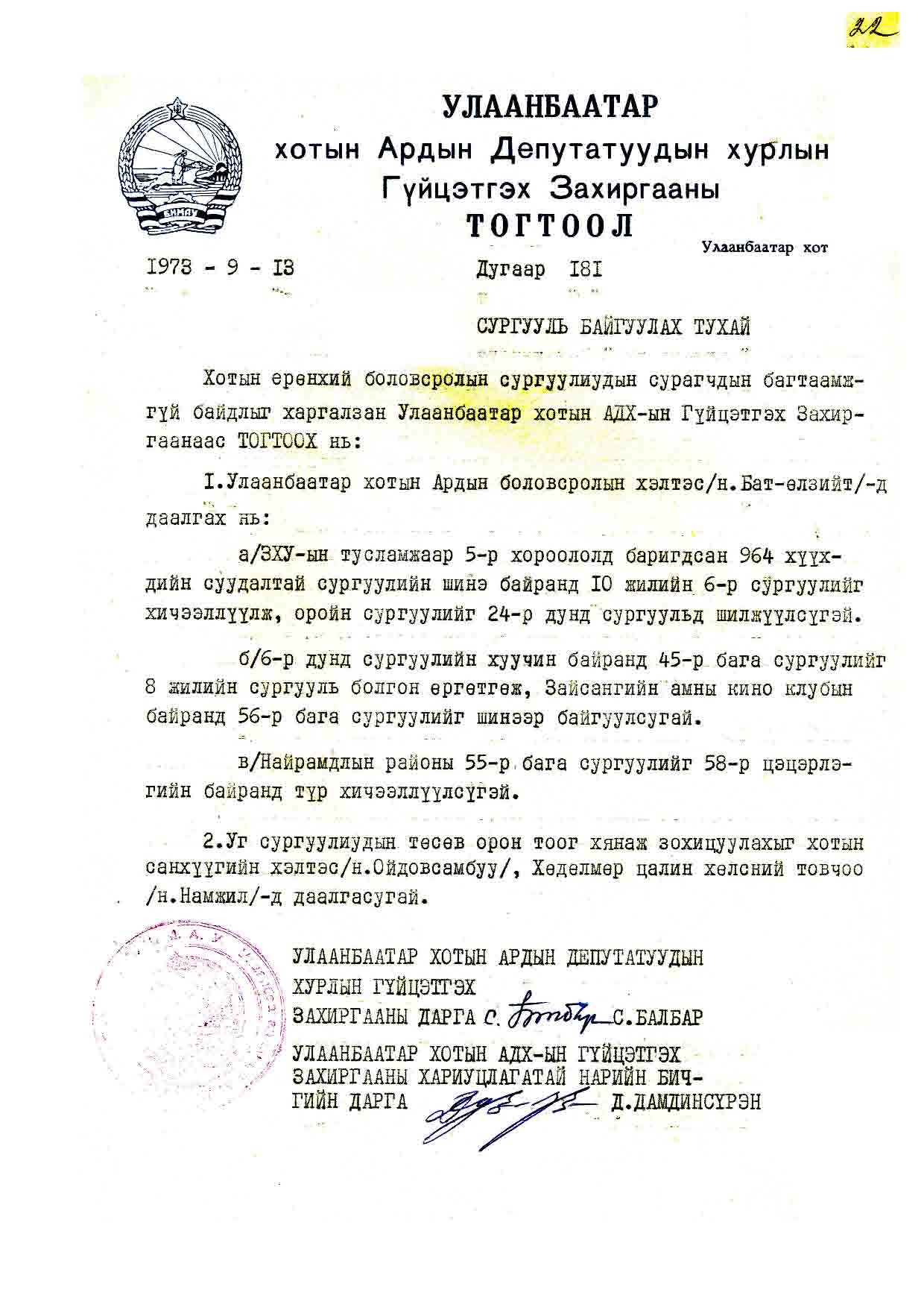 | АДХГЗ-ны тогтоол | 1973-09-13 | 181 | |