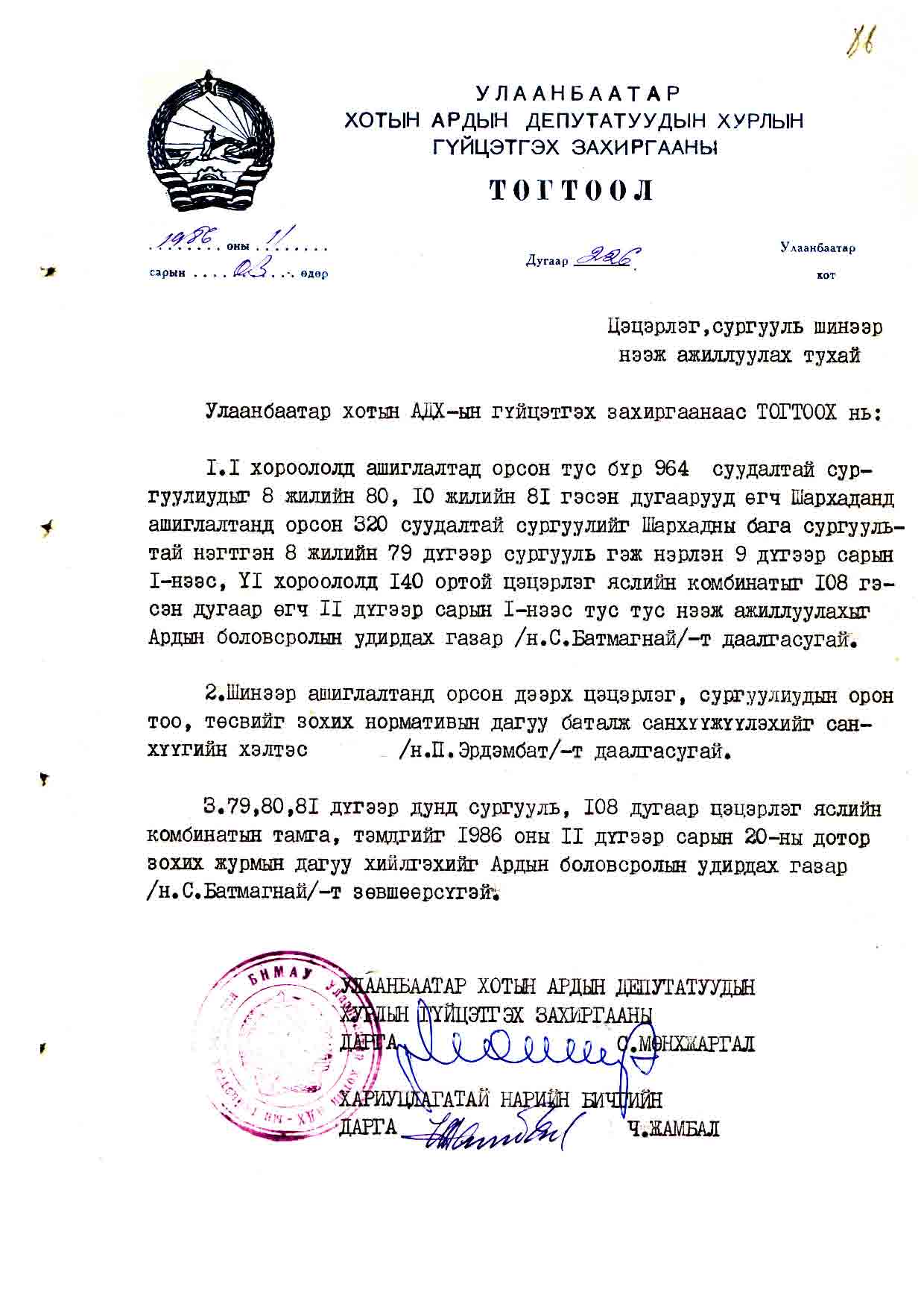 | УБ хотын АДХГЗ-ы тогтоол | 1986-11-03 | 226 | 81 дүгээр сургууль |