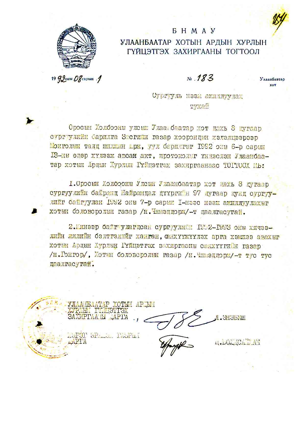 | АХГЗ-ны тогтоол | 1992-08-01 | 183 | найрамдал дүүргийн 97 дугаар сургууль |