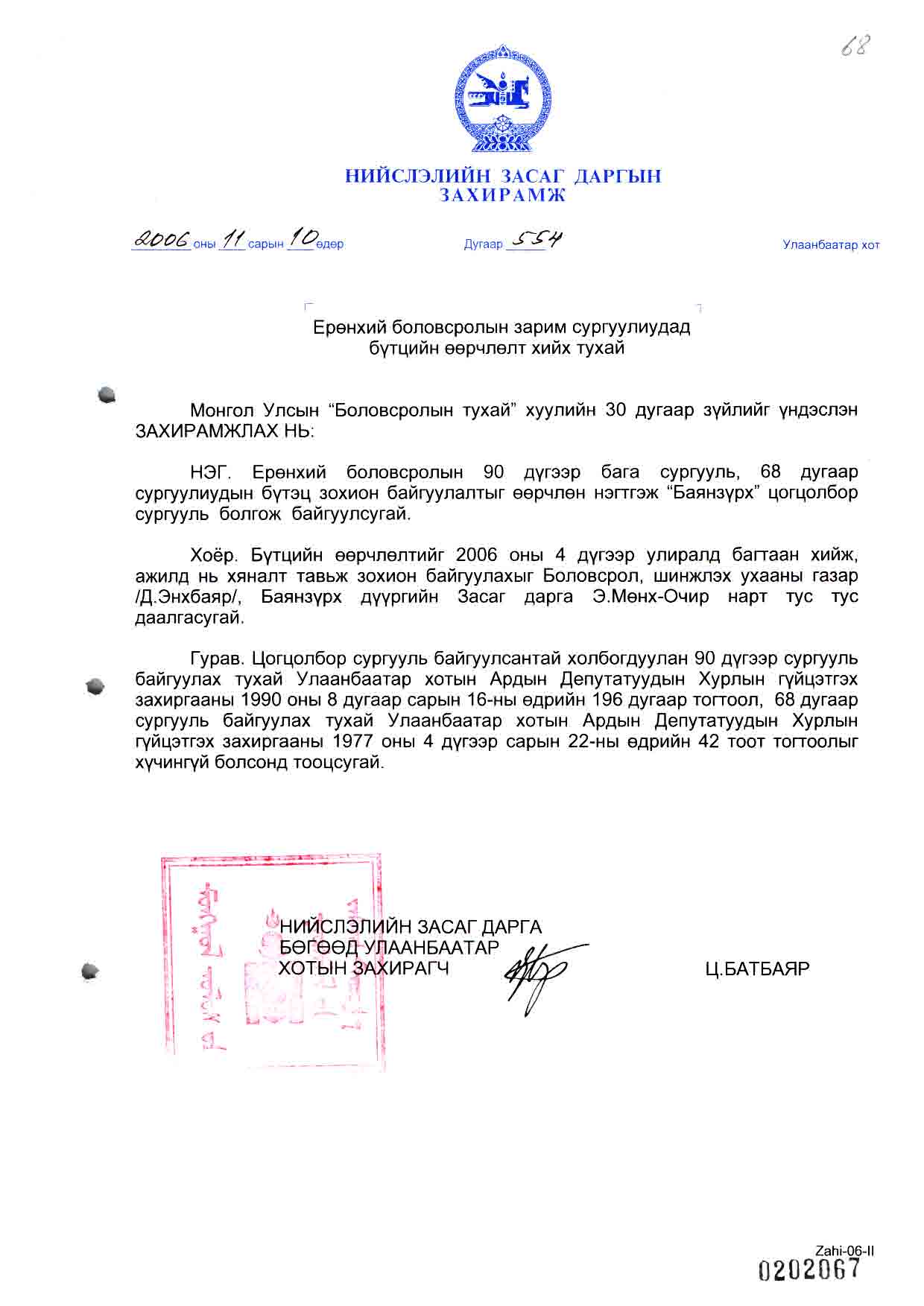 | НЗД-ын захирамж | 2006-11-10 | 554 | Баянзүрх цогцолбор сургууль |