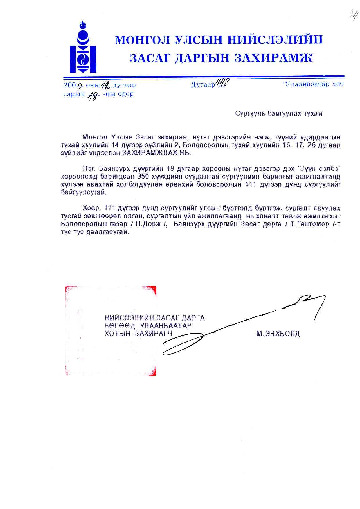 | НЗД-ын захирамж | 2000-12-18 | 448 | 111 дүгээр дунд сургууль |