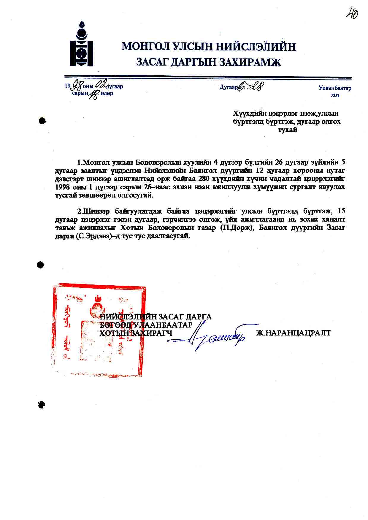 | Шийдвэр | Огноо | Дугаар | Нэр |