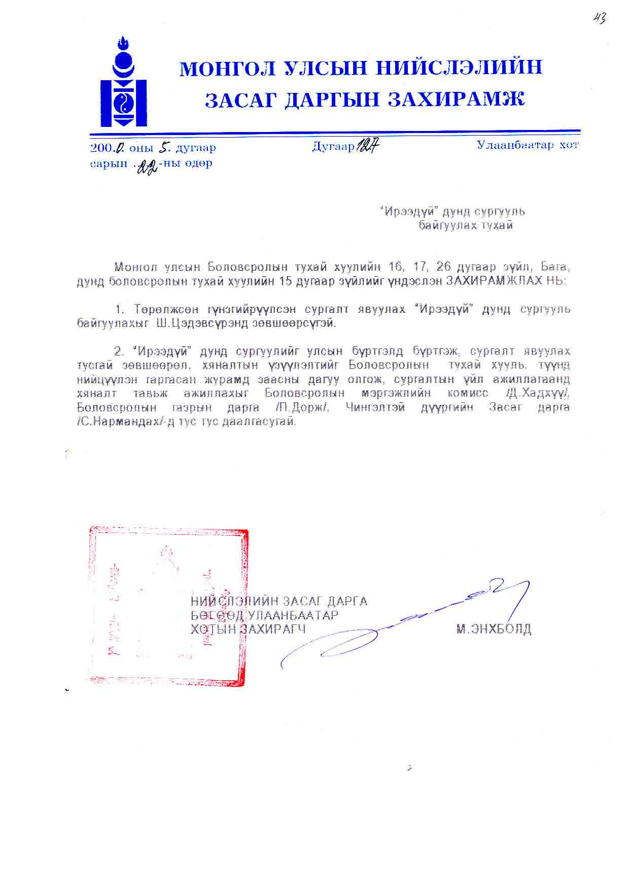 | Байгууллагын нэр | "Ирээдүй" дунд сургууль /Чингэлтэй дүүрэг/ |