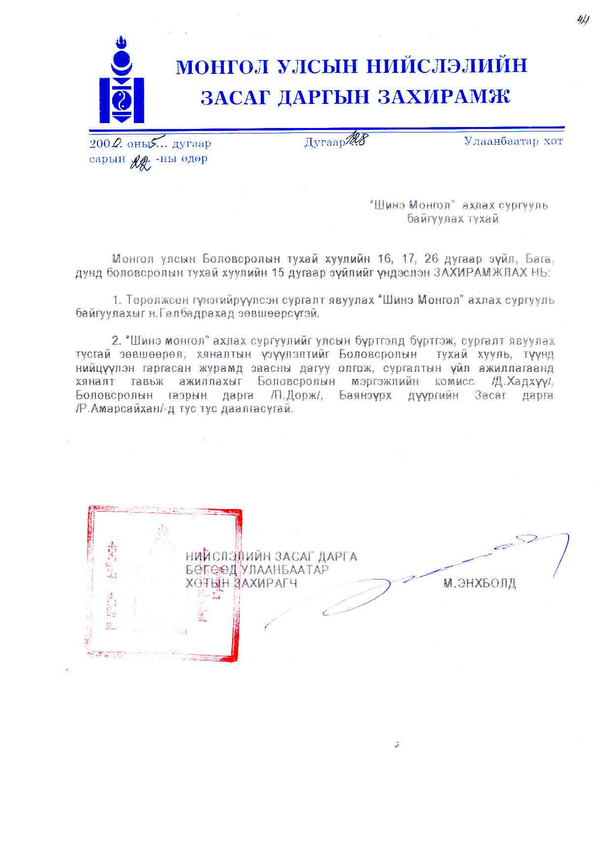 | НЗД-ын захирамж | 2006-06-14 | 301 | Шинэ Монгол бүрэн дунд сургууль |