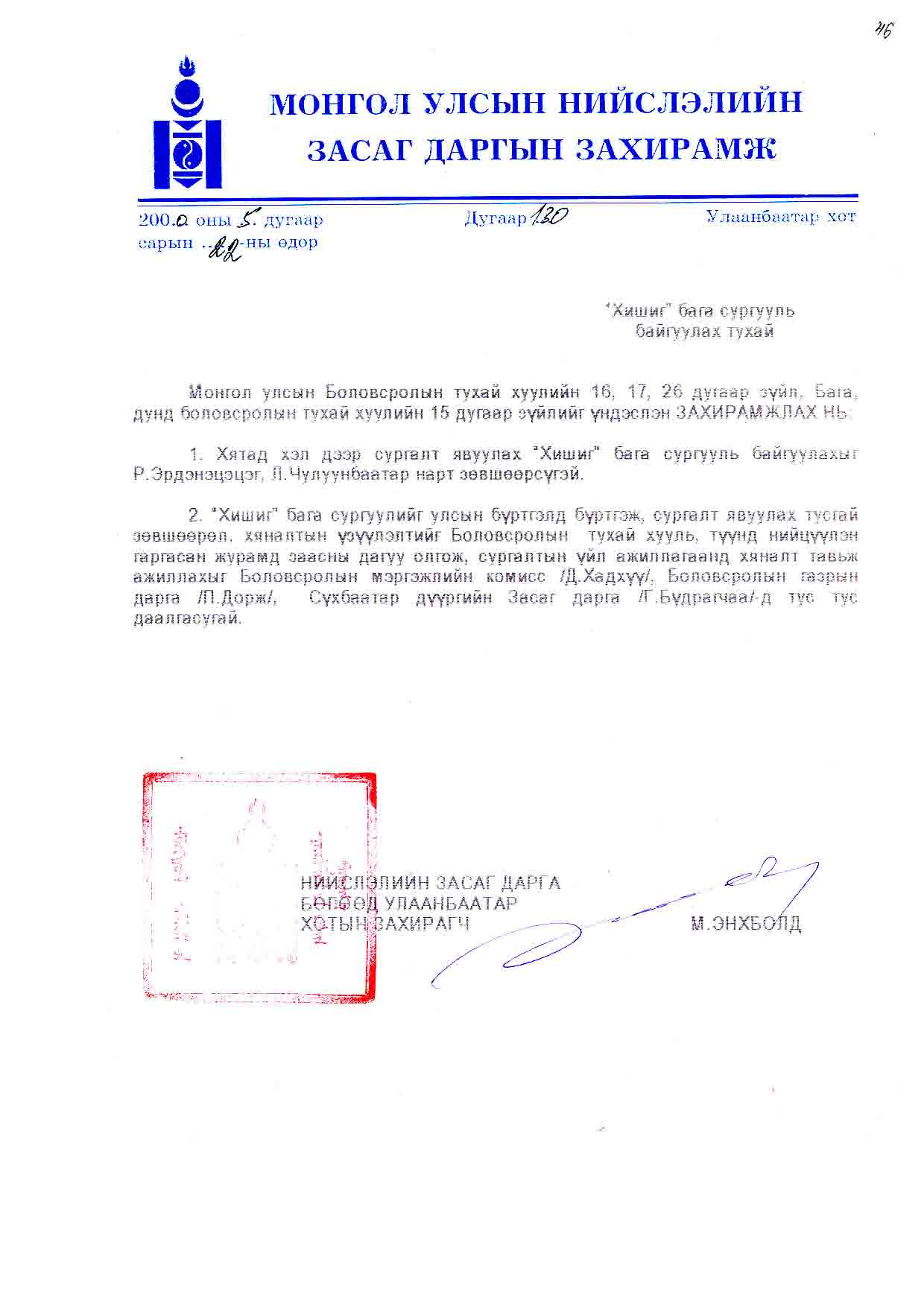 | Шийдвэр | Огноо | Дугаар | Нэр |