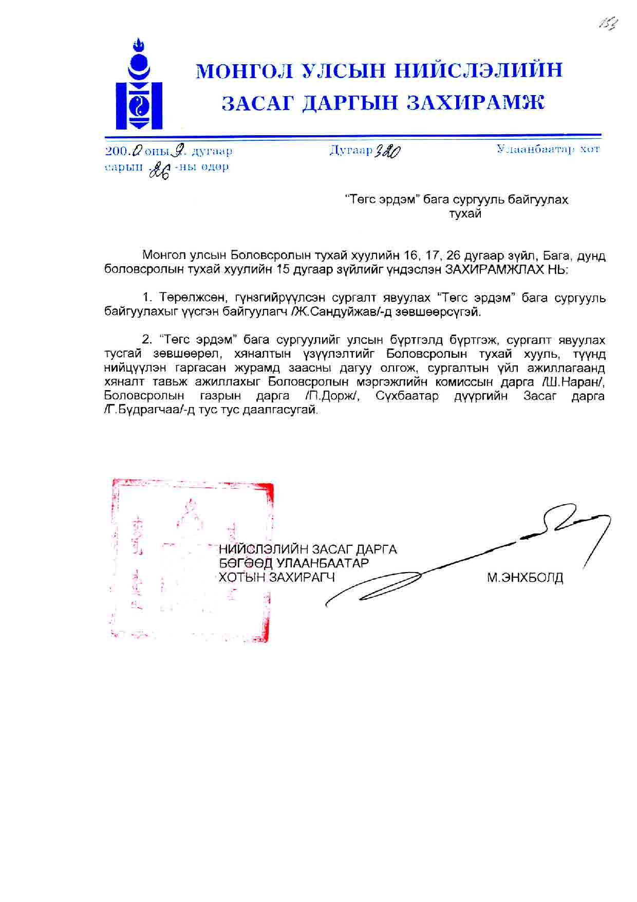 | Шийдвэр | Огноо | Дугаар | Нэр |