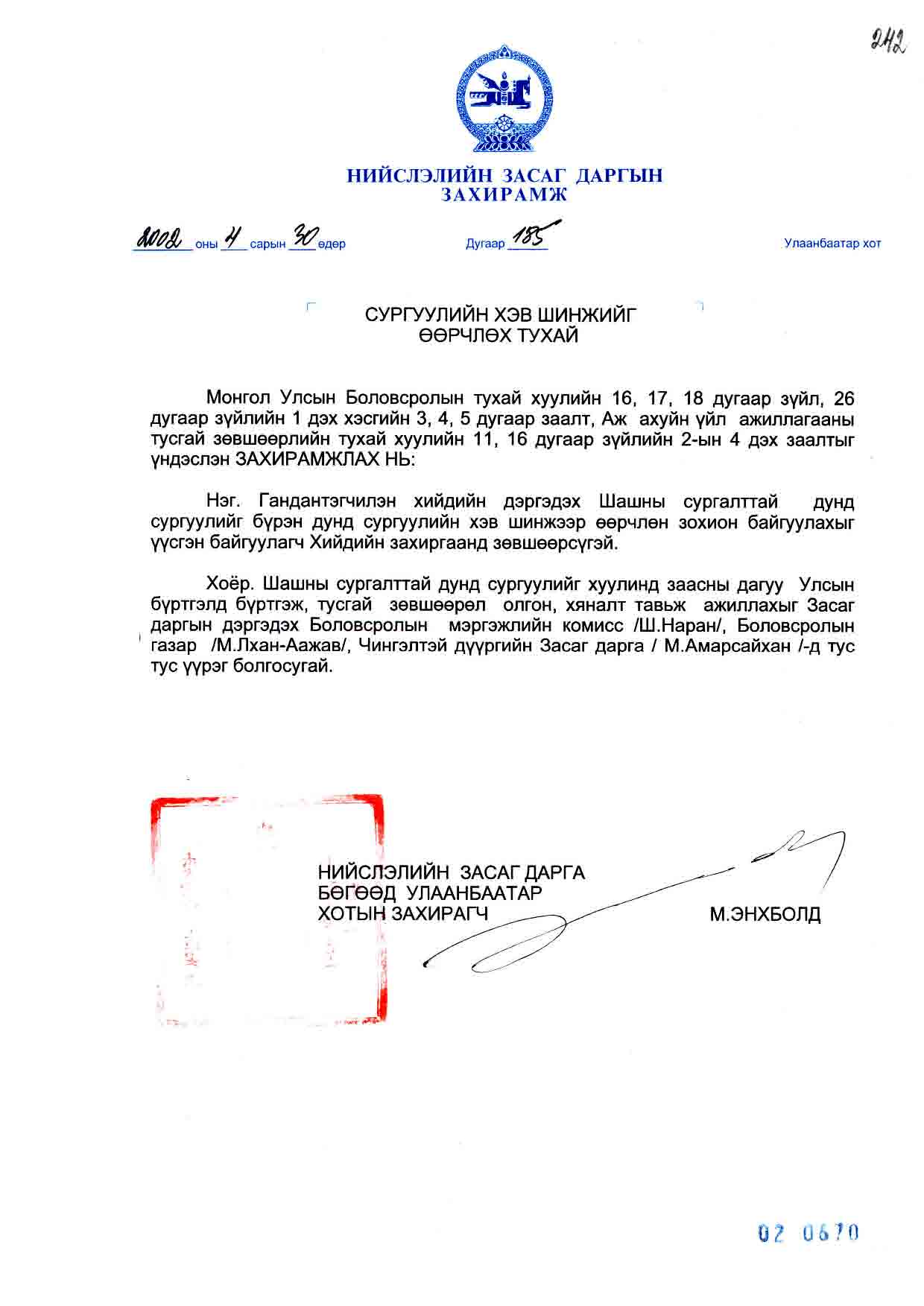 | НЗД-ын захирамж | 2002-04-30 | 185 | Гандантэгчилэн хийдийн дэргэдэх Шашны сургалттай бүрэн дунд сургууль |