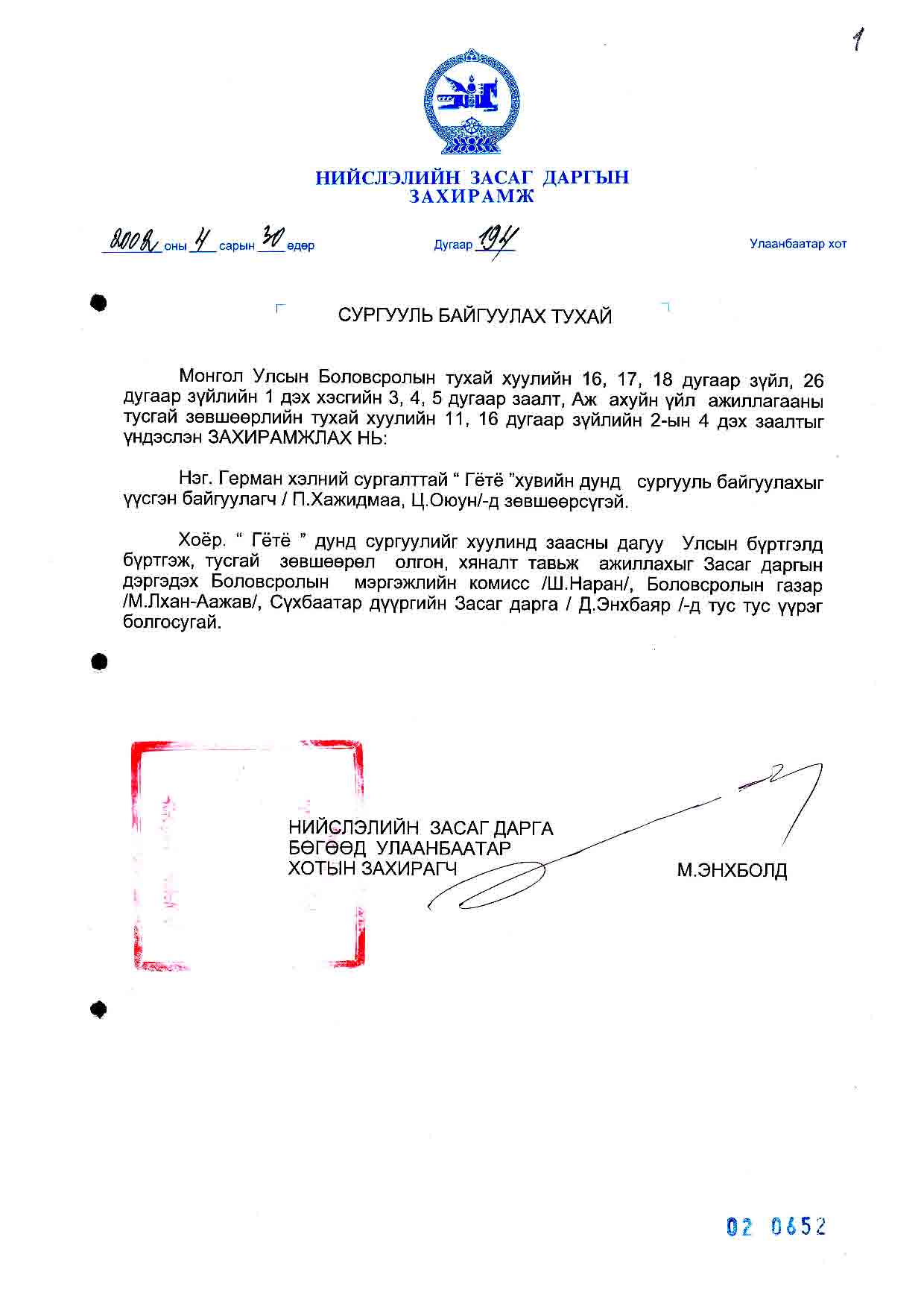 | НЗД-ын захирамж | 2002-04-30 | 194 | Гётё дунд сургууль |
