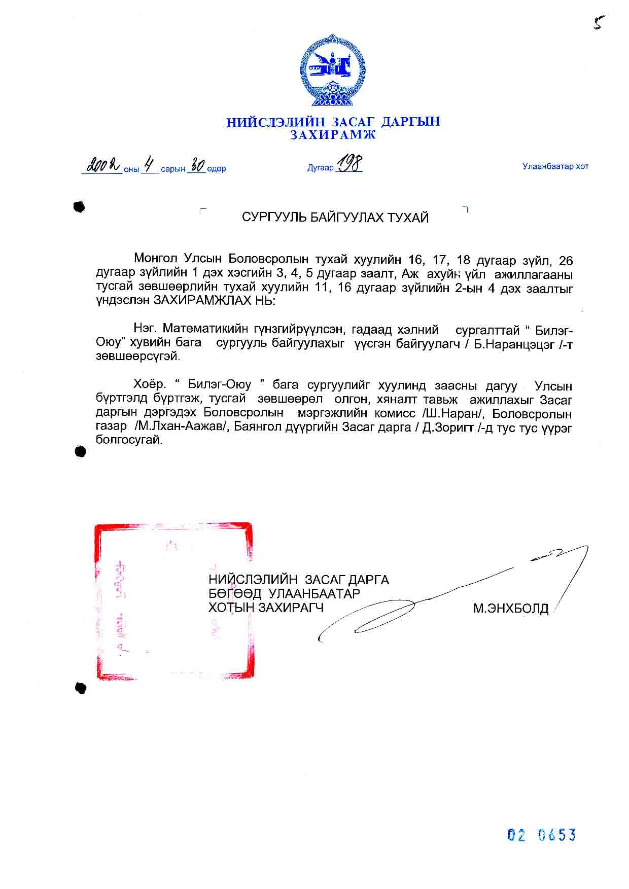 | НЗД-ын захирамж | 2002-04-30 | 198 | Билэг-Оюу бага сургууль |