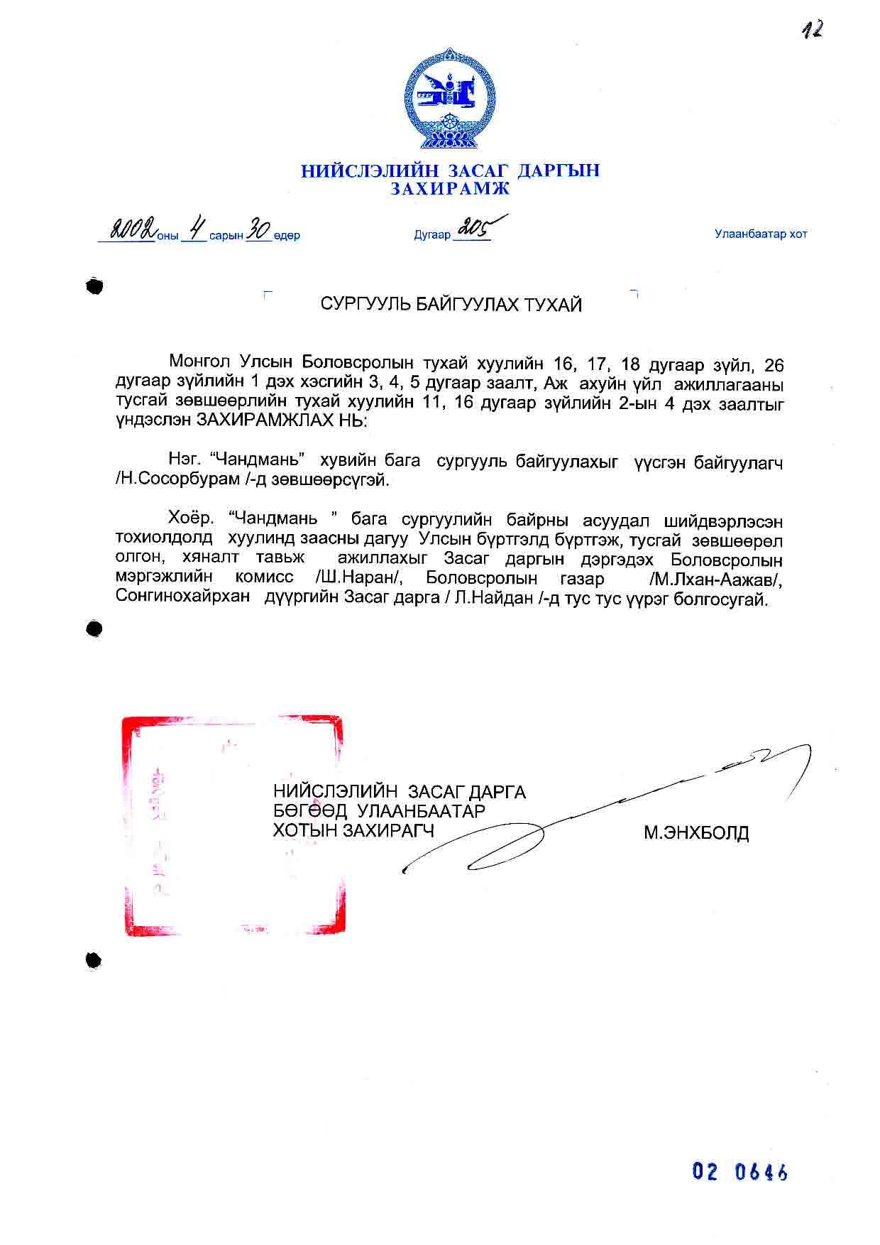 | НЗД-ын захирамж | 2002-04-30 | 205 | Чандмань бага сургууль |