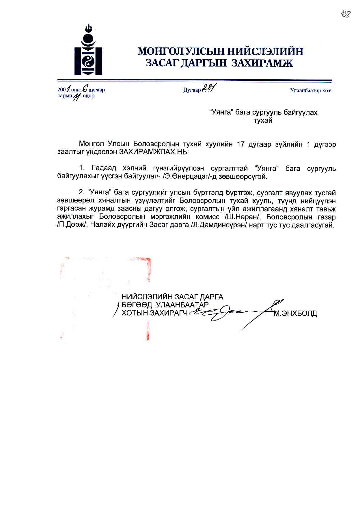 | НЗД-ын захирамж | 2001-06-11 | 281 | Уянга бага сургууль |