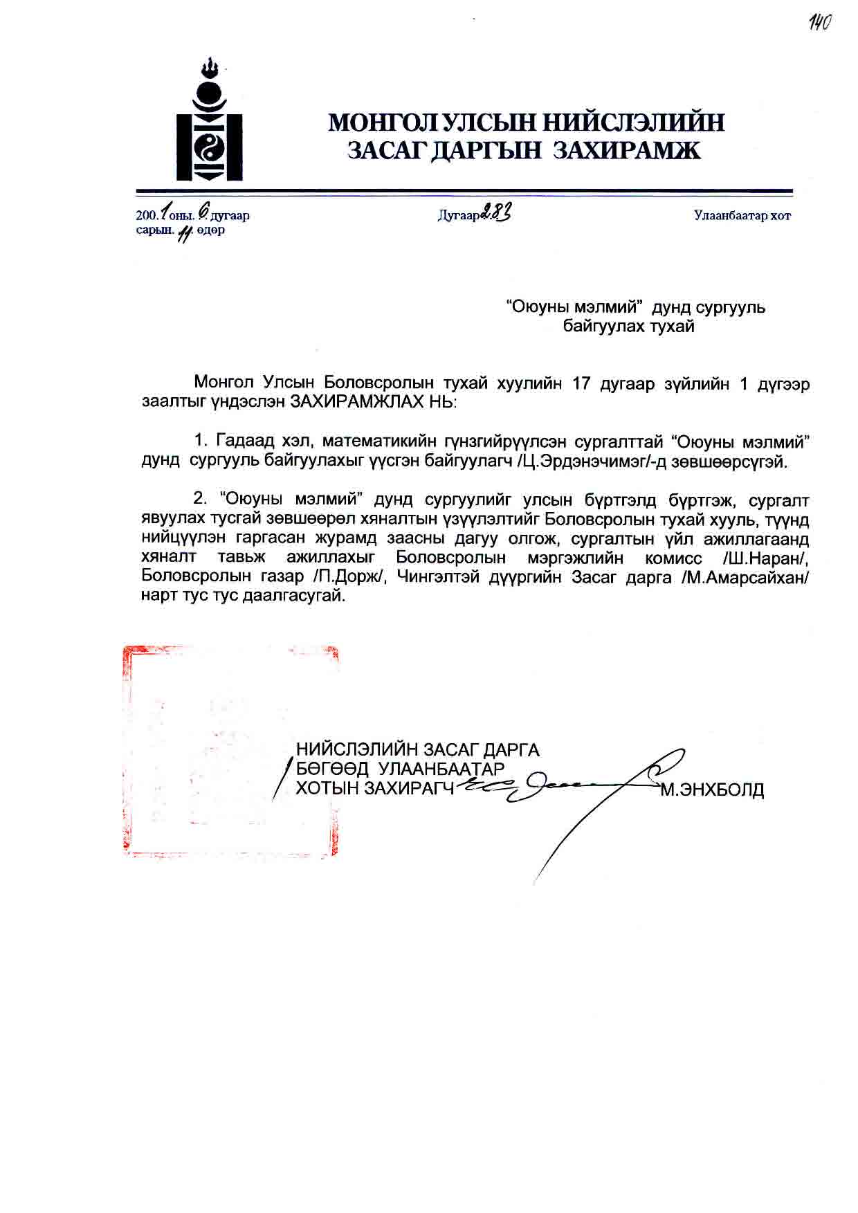 | НЗД-ын захирамж | 2001-06-11 | 283 | Оюуны мэлмий дунд сургууль |