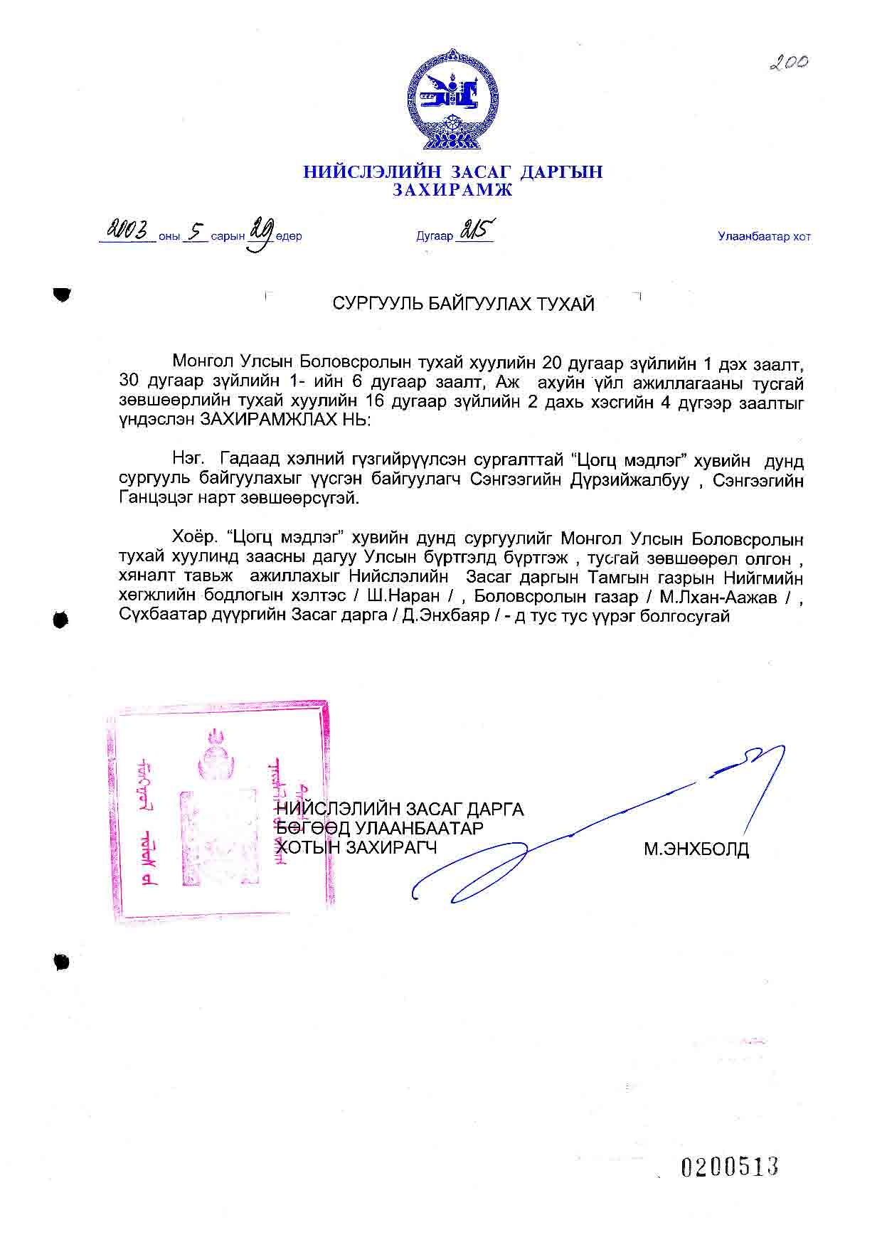 | Шийдвэр | Огноо | Дугаар | Нэр |