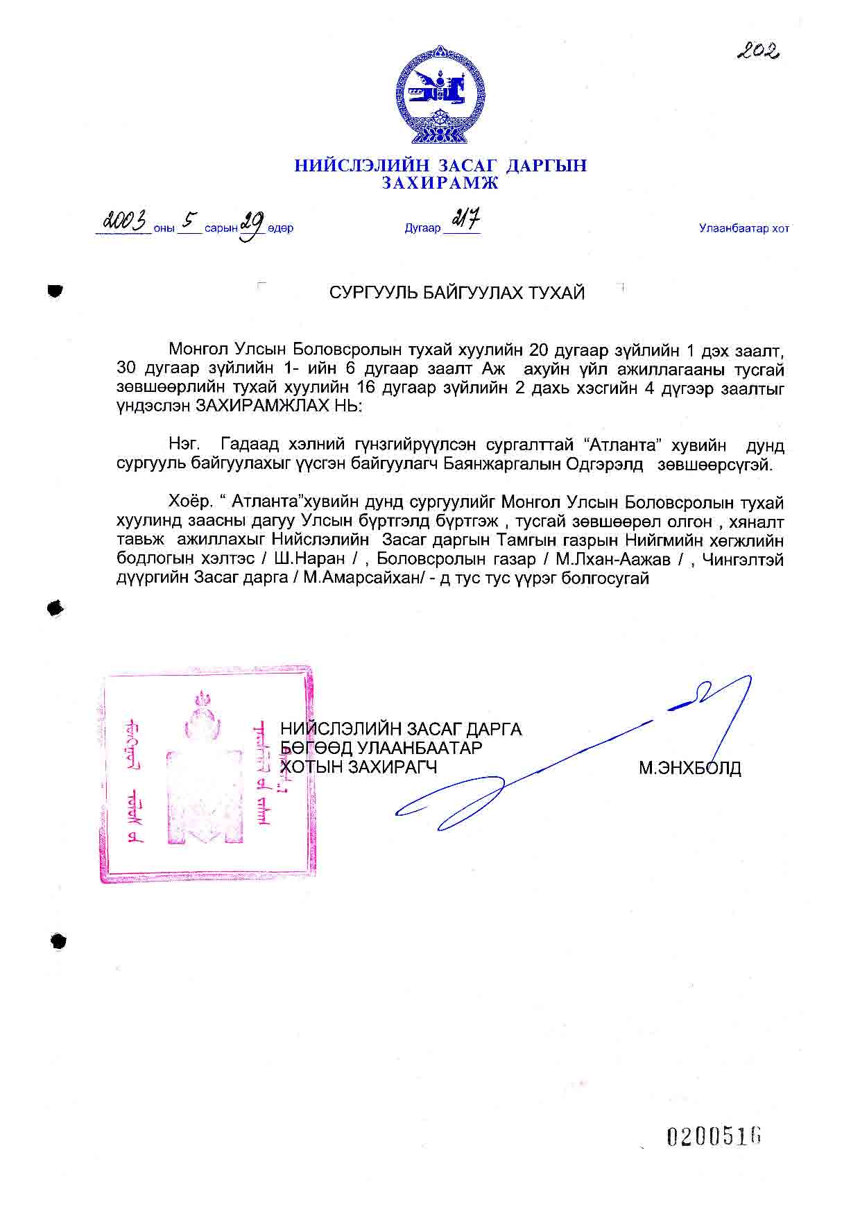 | Шийдвэр | Огноо | Дугаар | Нэр |