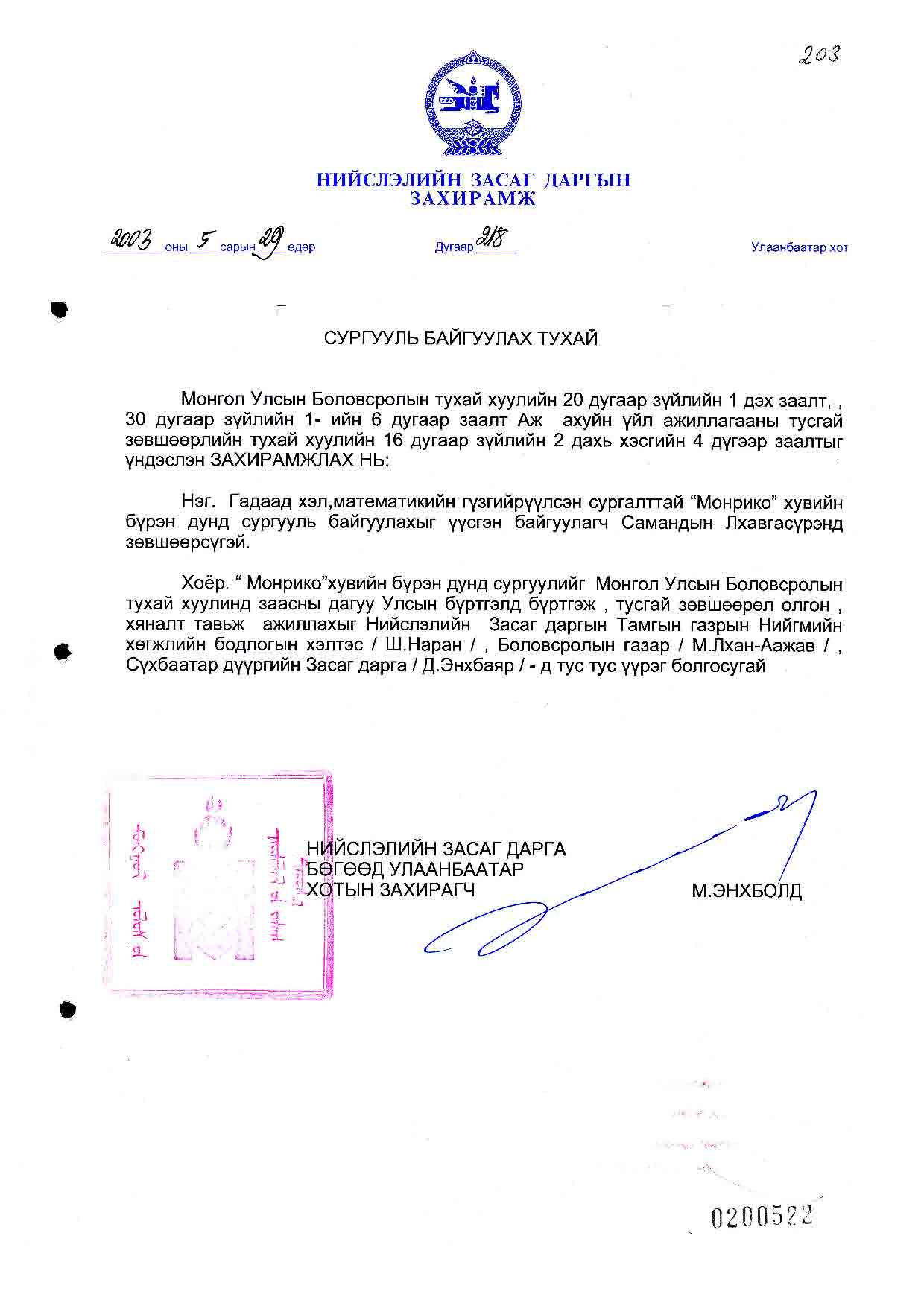 | Байгууллагын нэр | "Монрико" хувийн бүрэн дунд сургууль /Сүхбаатар дүүрэг/ |