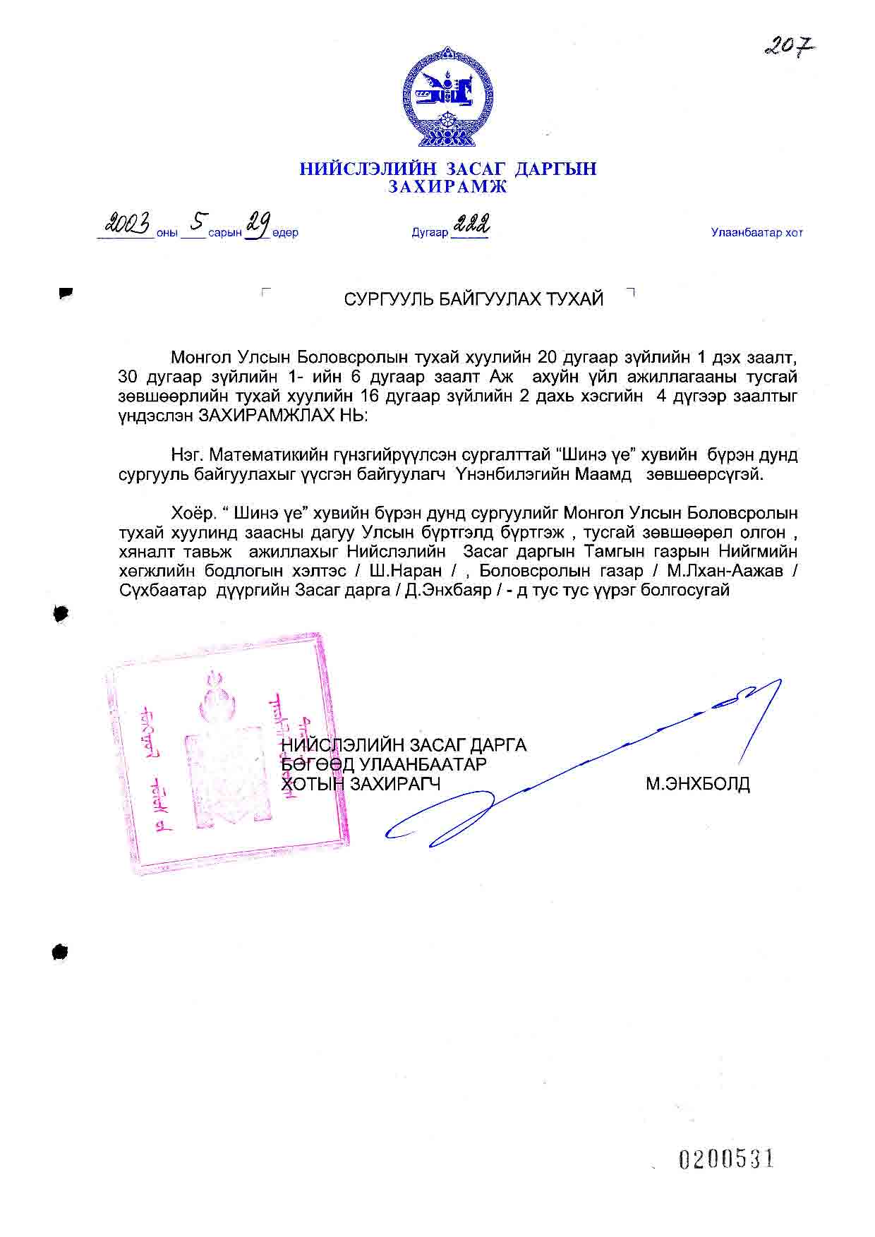| Шийдвэр | Огноо | Дугаар | Нэр |