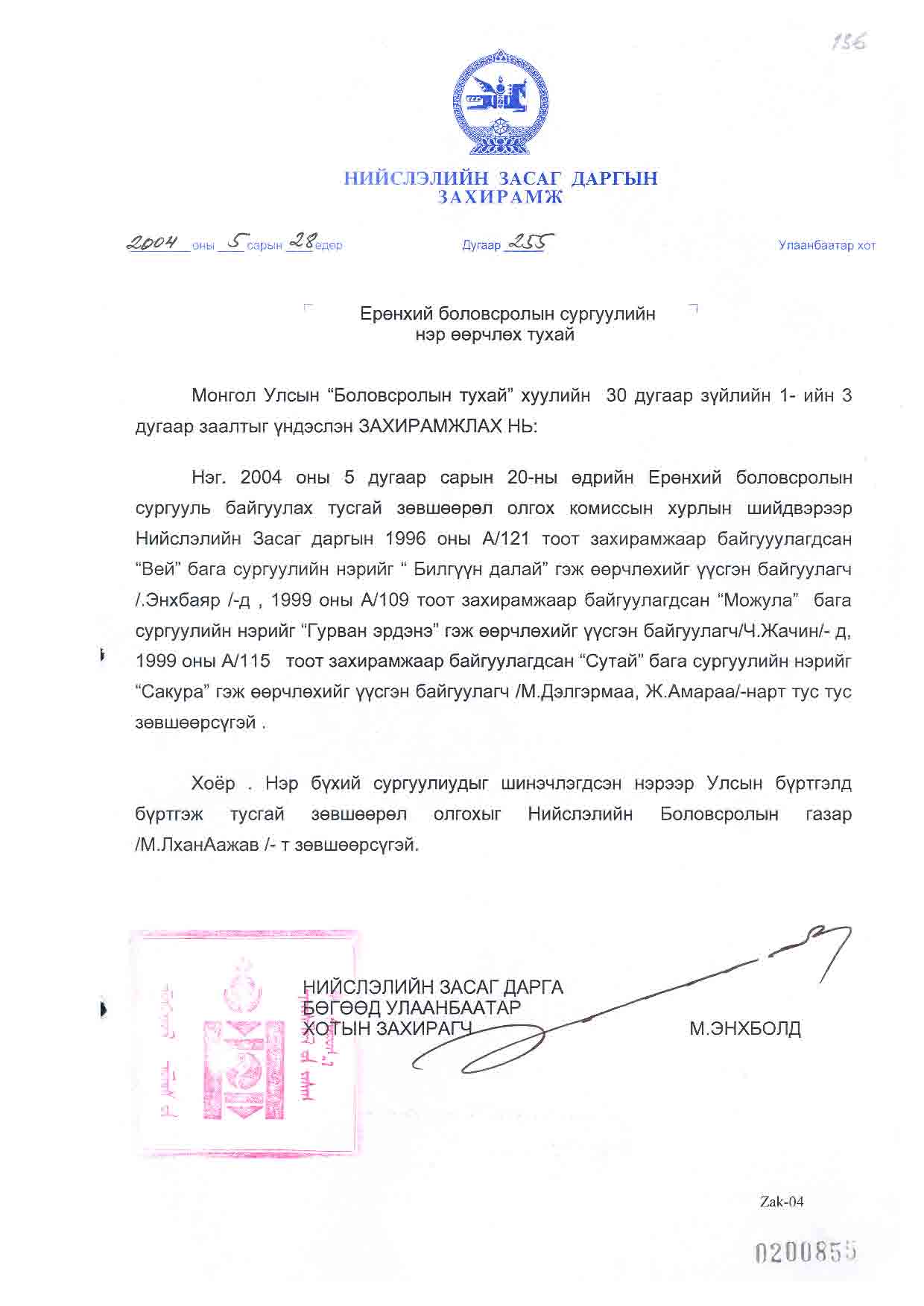 | НЗД-ын захирамж | 2004-05-28 | 255 | |