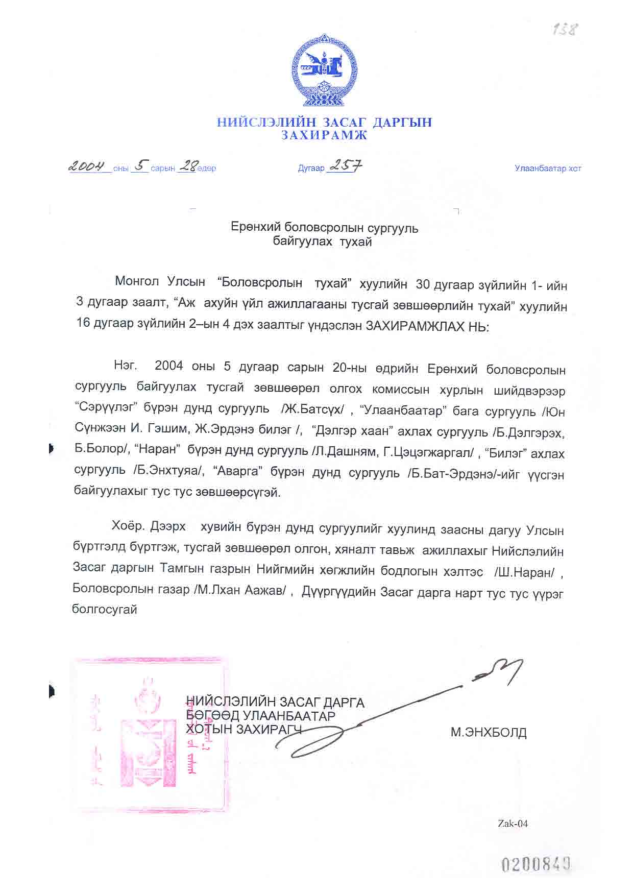 | Шийдвэр | Огноо | Дугаар | Нэр |