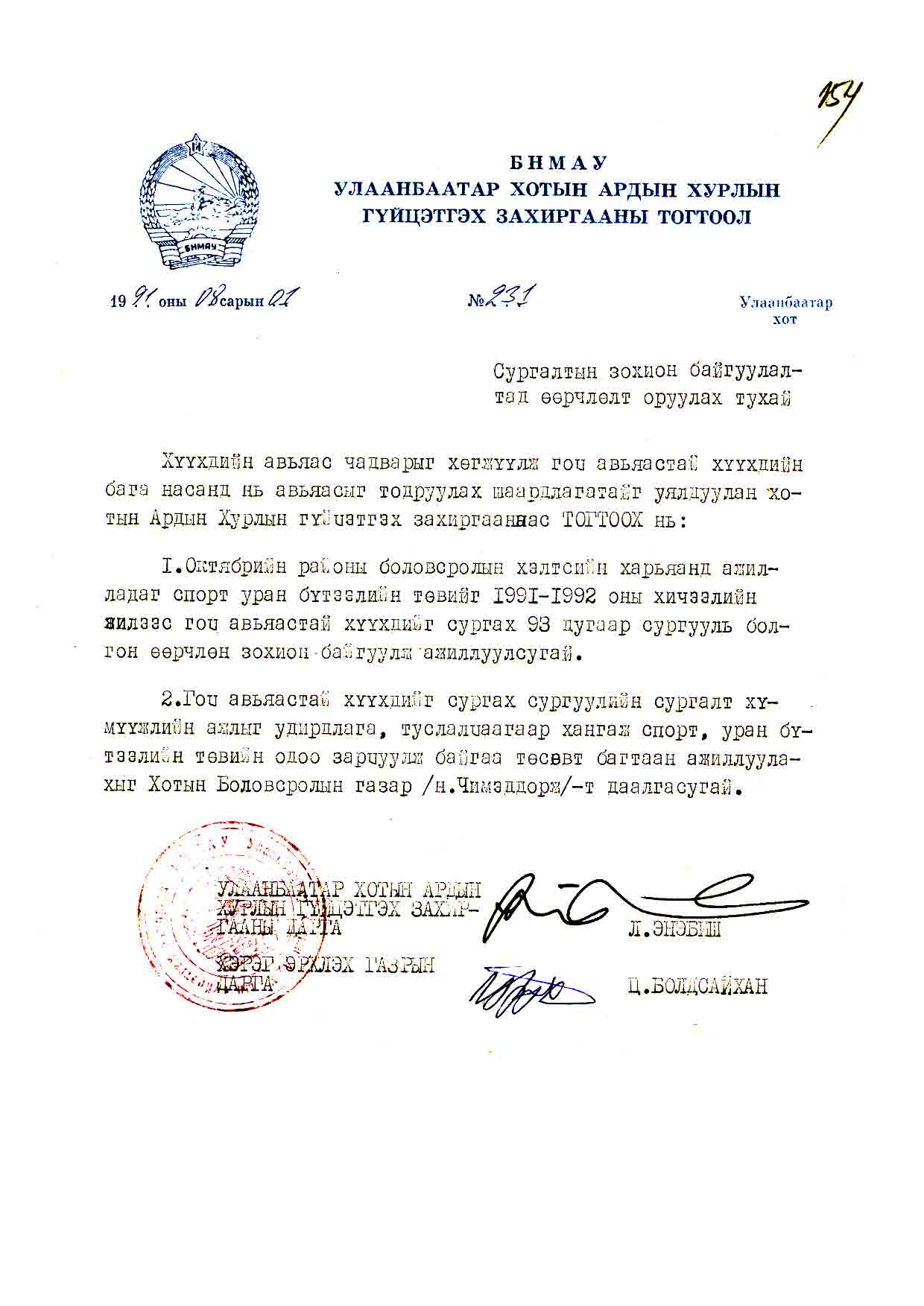 | АДХГЗ-ны тогтоол | 1991-08-01 | 231 | Гоц авьяастай хүүхдийг сургах 93 дугаар сургууль |
