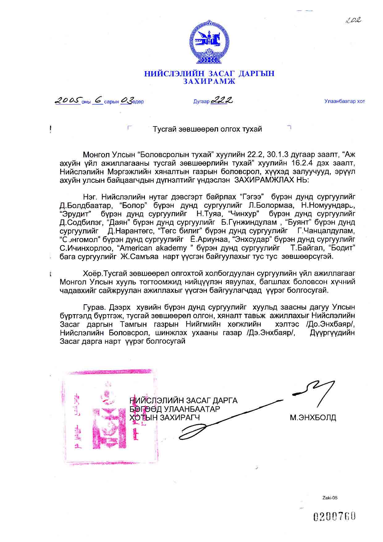 | НЗД-ын захирамж | 2005-06-03 | 222 | |