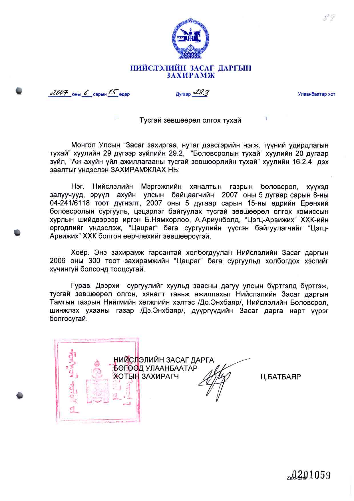 | НЗД-ын захирамж | 2007-06-15 | 283 | Цэгц Арвижих ХХК |