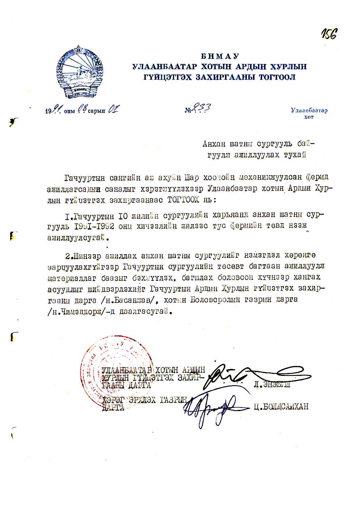 | УБ хотын АДХГЗ-ы тогтоол | 1991-08-01 | 233 | Анхан шатны сургууль |