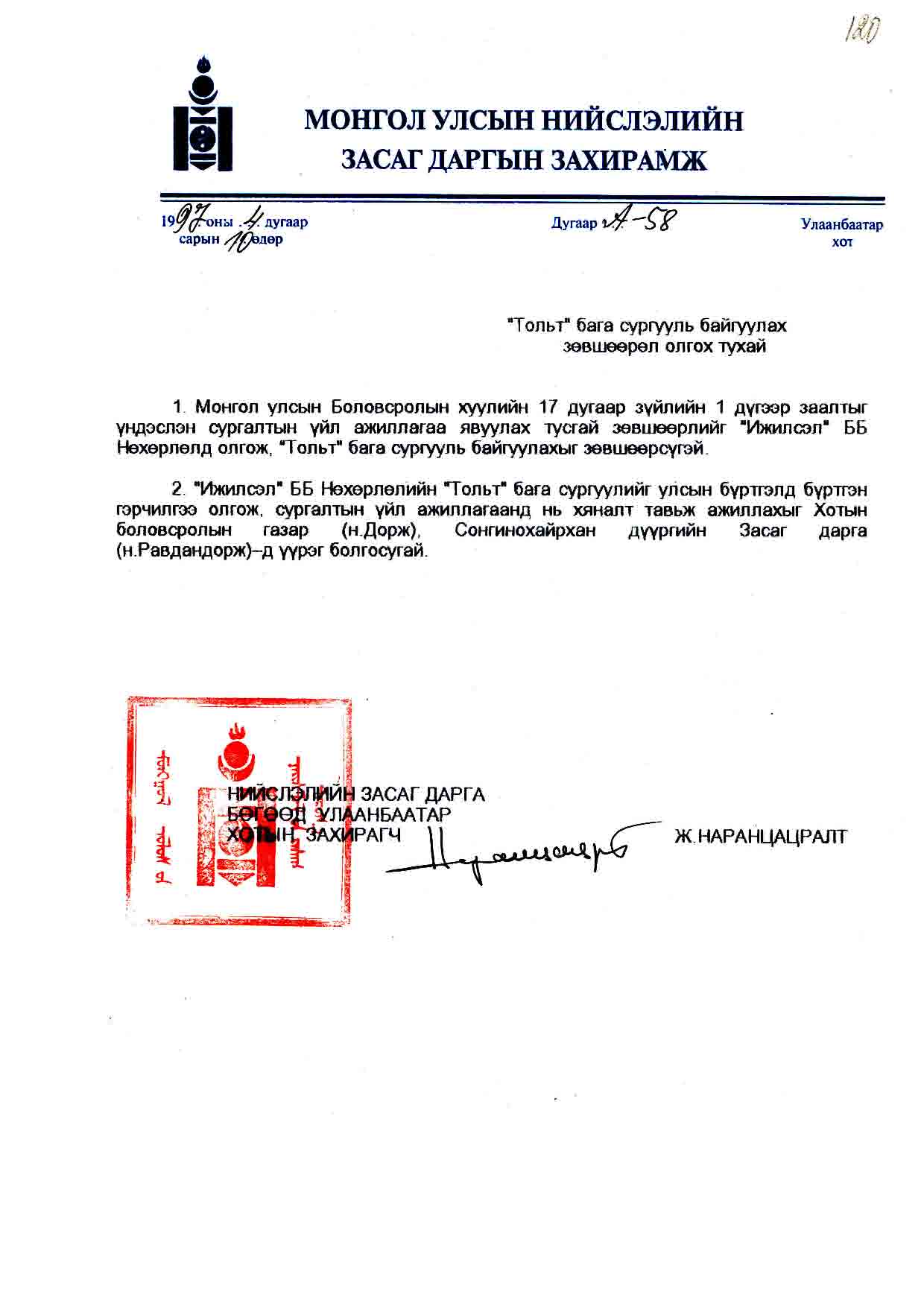 | НЗД-ын захирамж | 1997-04-10 | А/58 | Тольт бага сургууль |