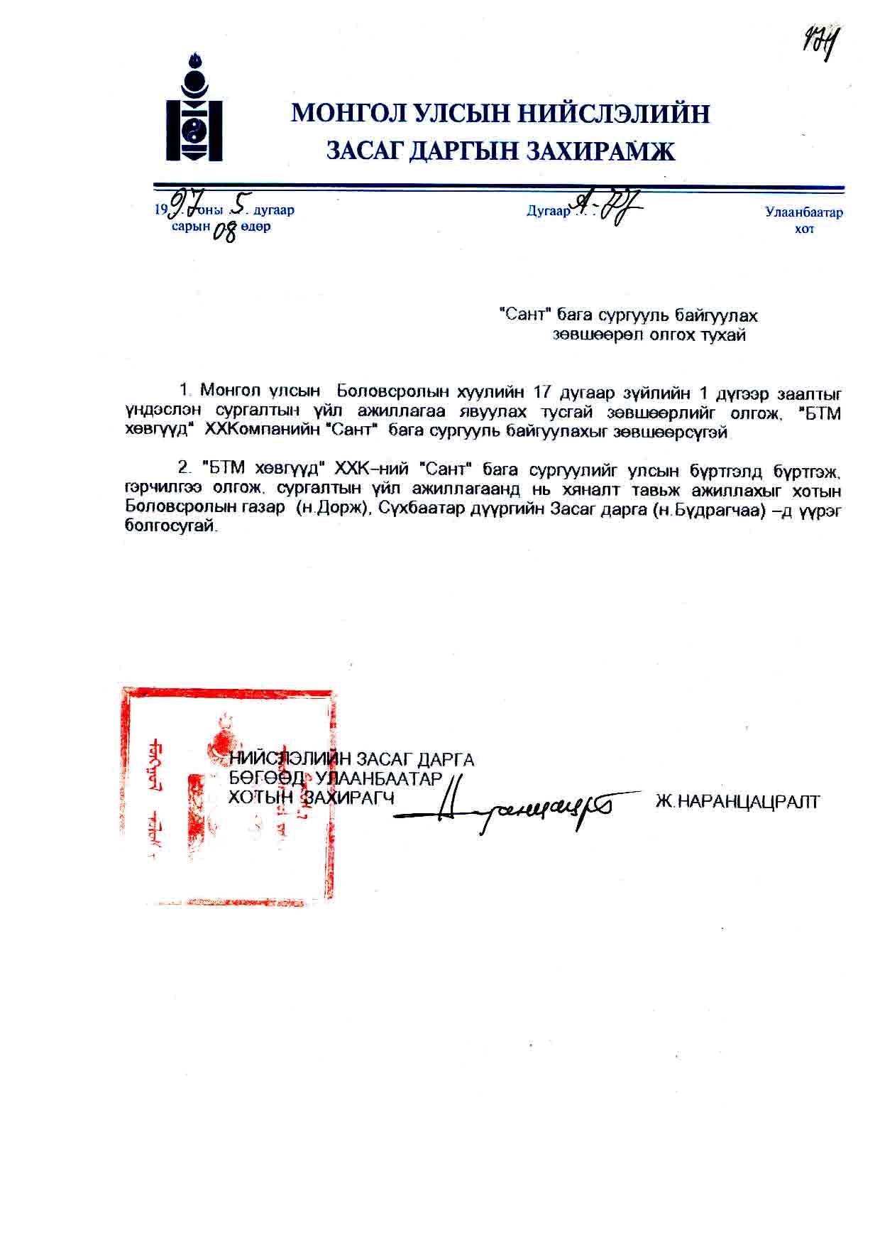 | Байгууллагын нэр | Сант бага сургууль /Сүхбаатар дүүрэг/ |