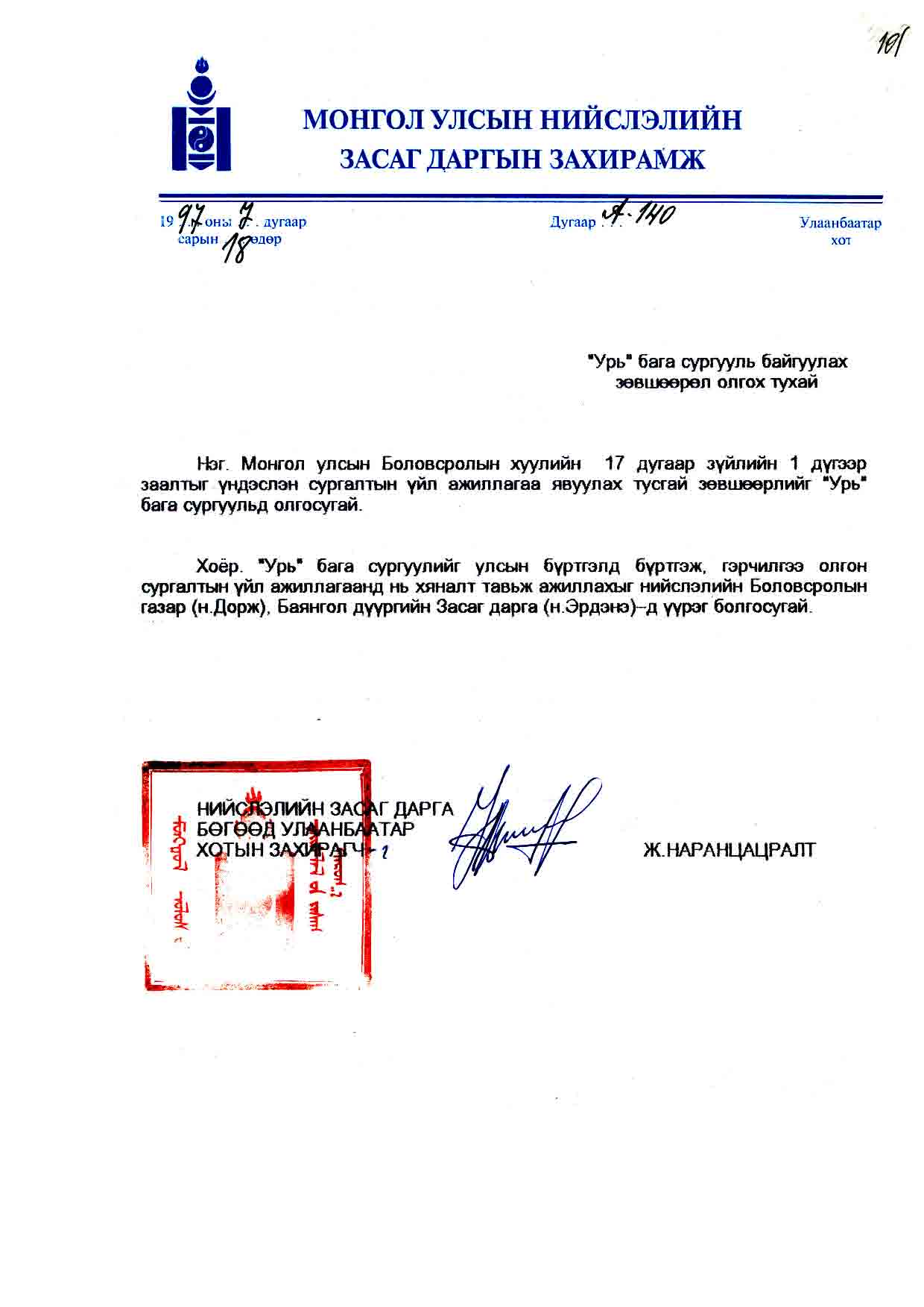 | НЗД-ын захирамж | 1997-07-18 | А/140 | |
