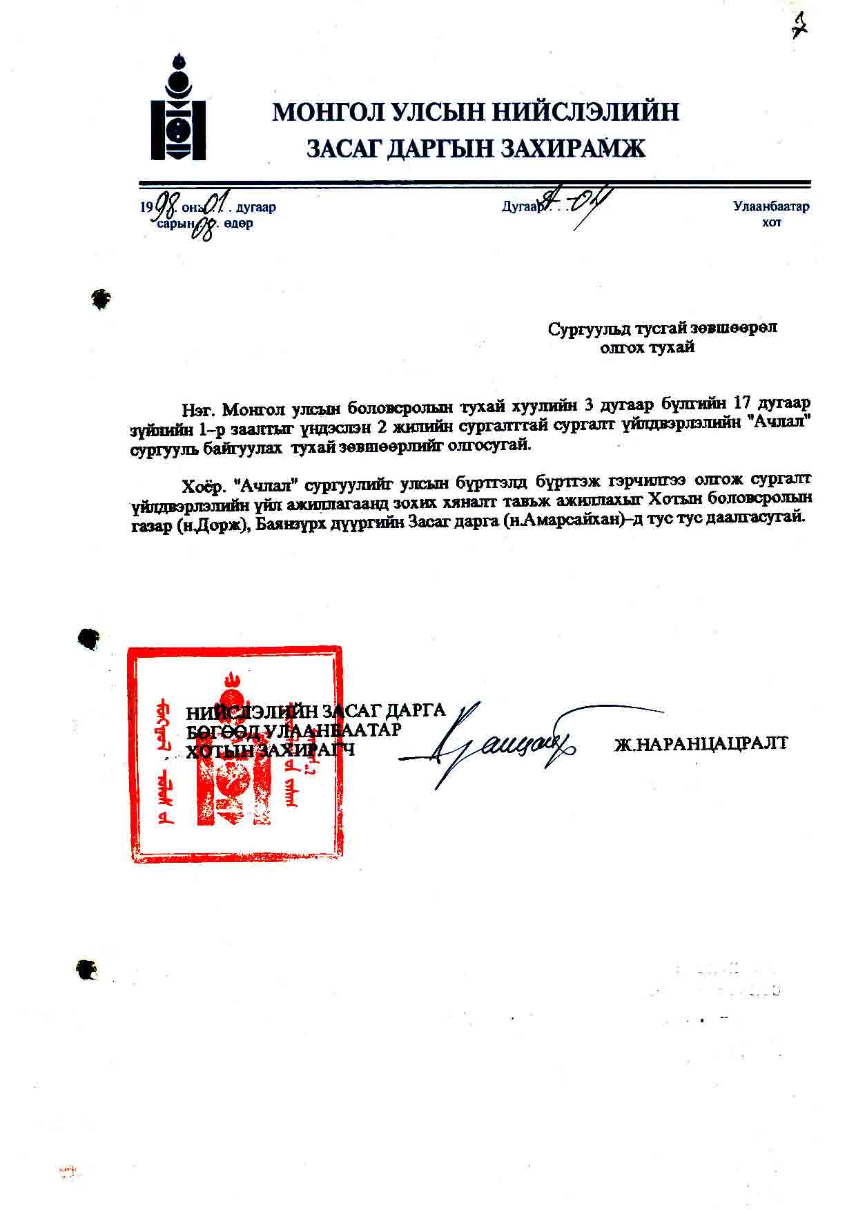 | Байгууллагын нэр | Ачлал сургууль /Баянзүрх дүүрэг/ |