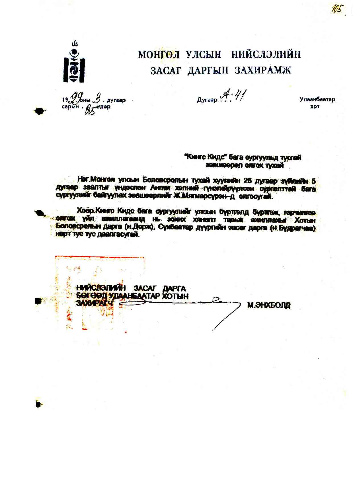 | Байгууллагын нэр | Кингс Кидс бага сургууль /Сүхбаатар дүүрэг/ |