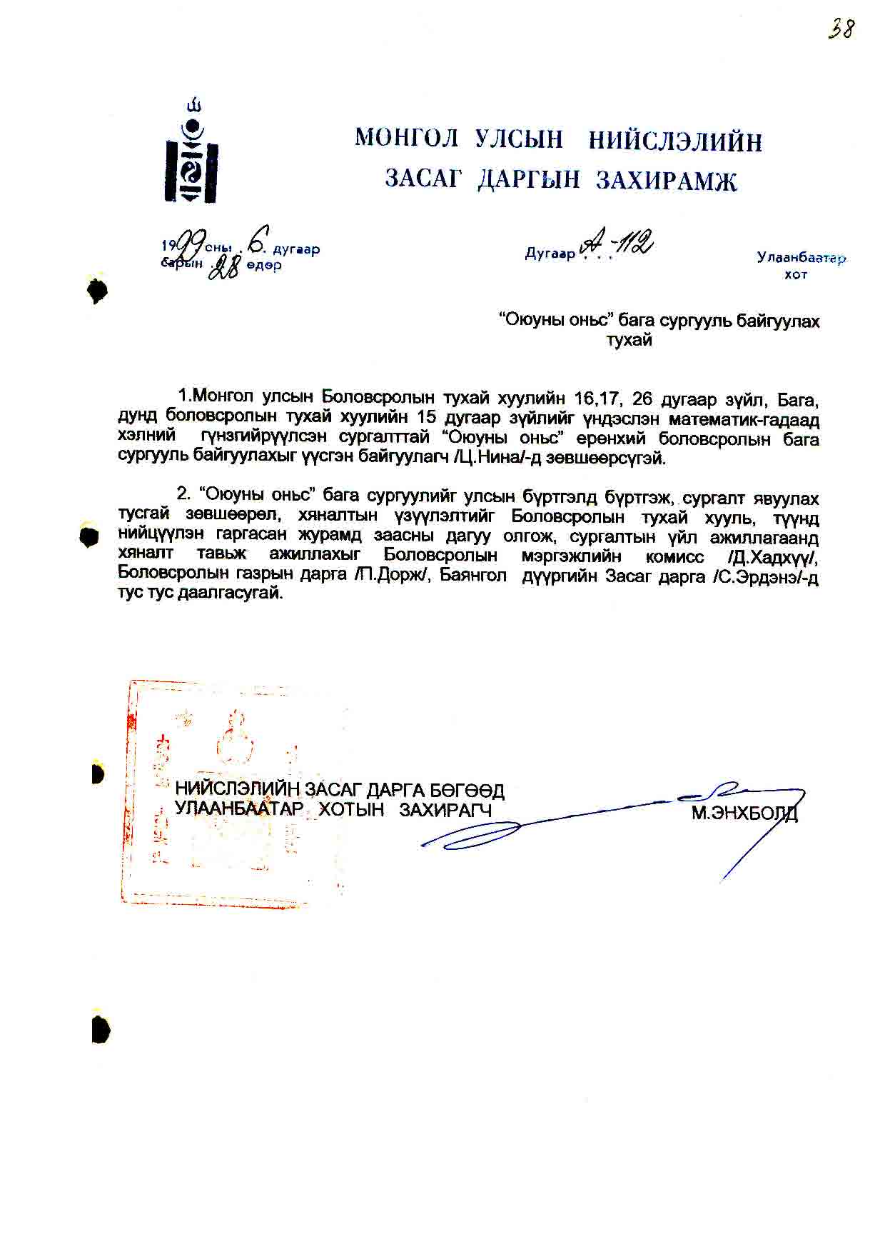 | Байгууллагын нэр | Оюуны оньс бага сургууль /Баянгол дүүрэг/ |