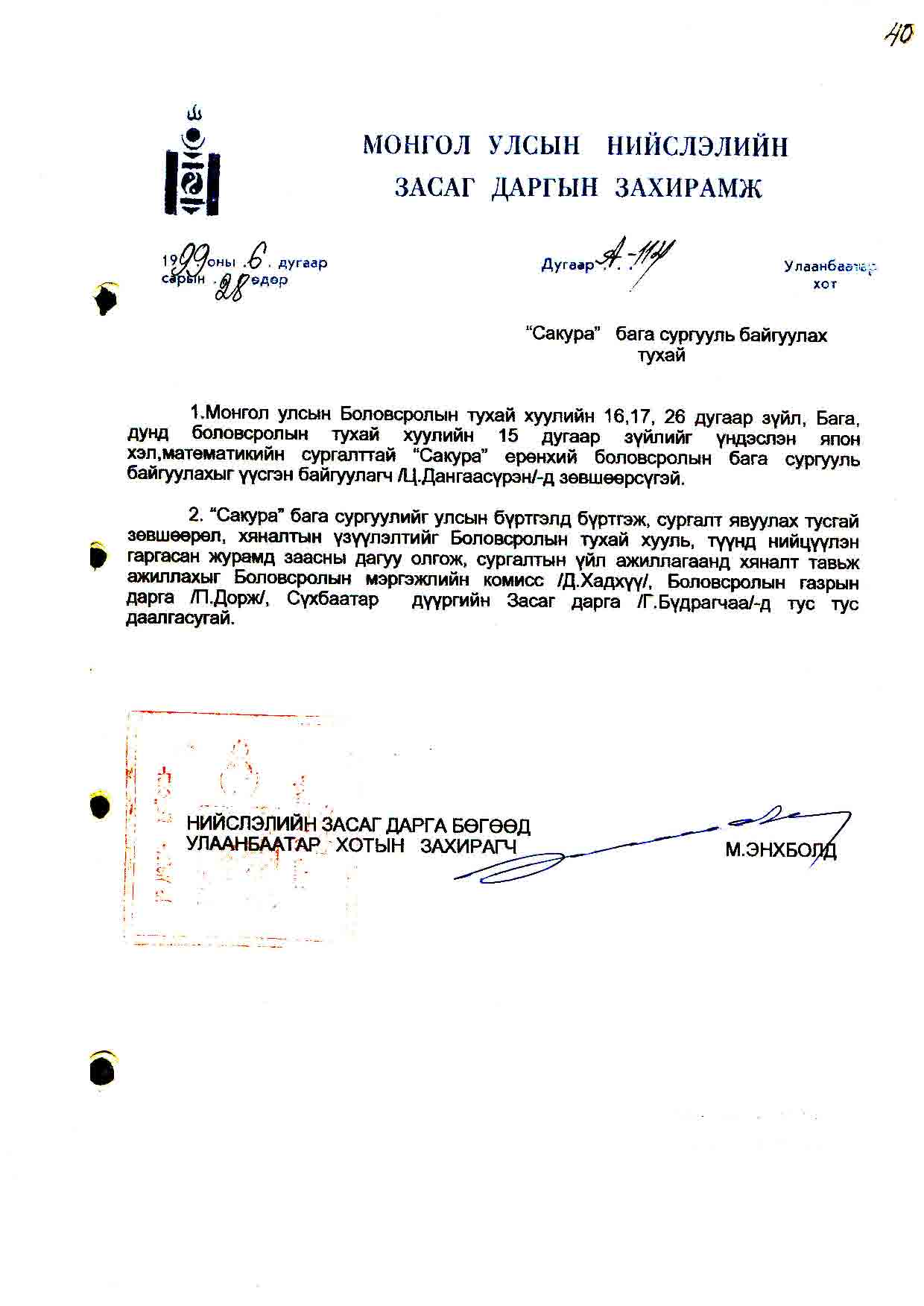 | Байгууллагын нэр | Сакура бага сургууль /Сүхбаатар дүүрэг/ |