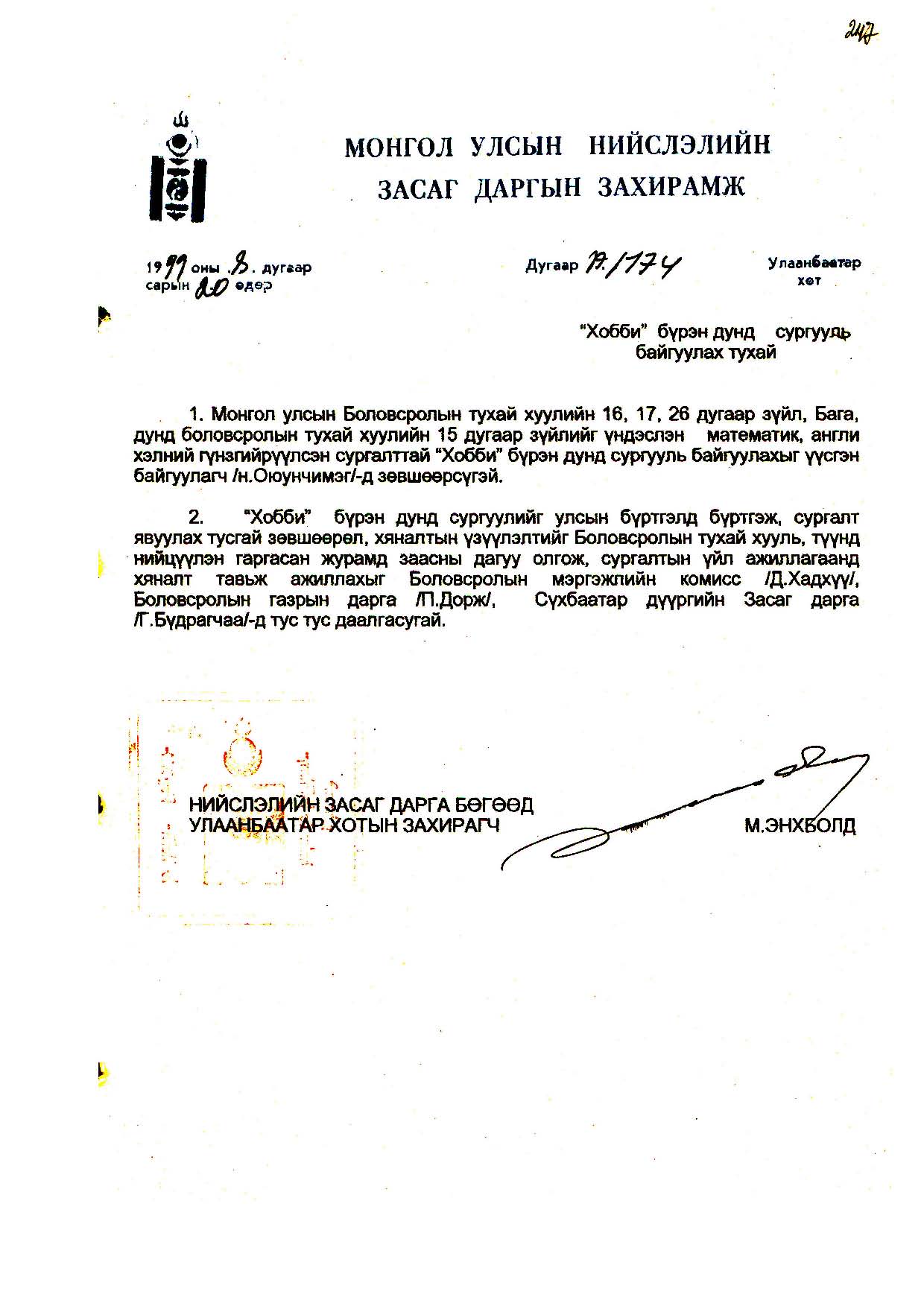 | Байгууллагын нэр | Хобби бүрэн дунд сургууль /Сүхбаатар дүүрэг/ |