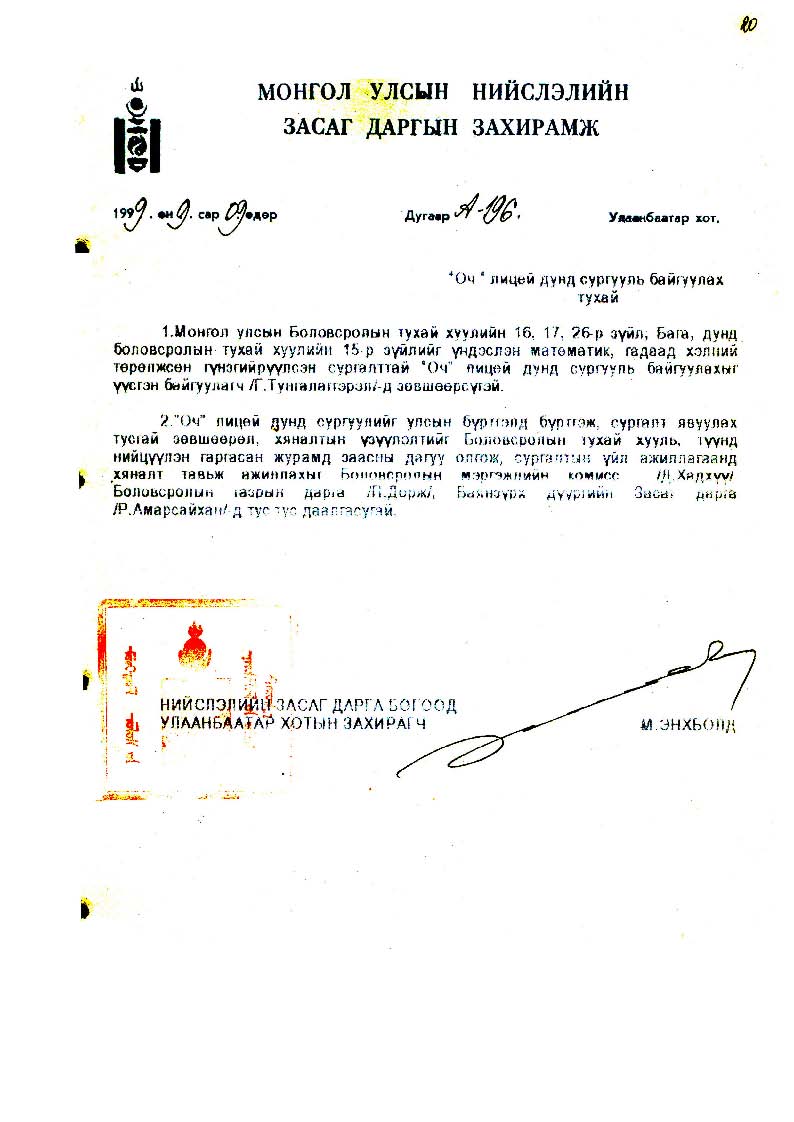 | Байгууллагын нэр | Оч лицей дунд сургууль /Баянзүрх дүүрэг/ |